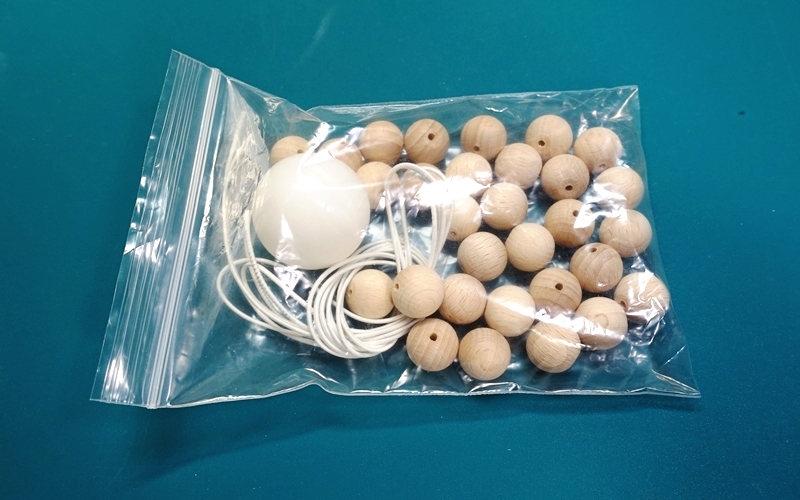 ・ 木製 ビーズ 30個 (直径17mm,約2mm貫通穴) ・ ゴム紐(1本1800mm) ・ ピンポン玉(40mm) |