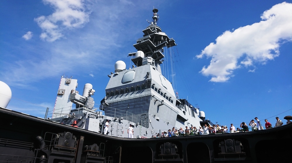 (8)甲板上で自撮りをしている私とブリッジ(艦橋) |