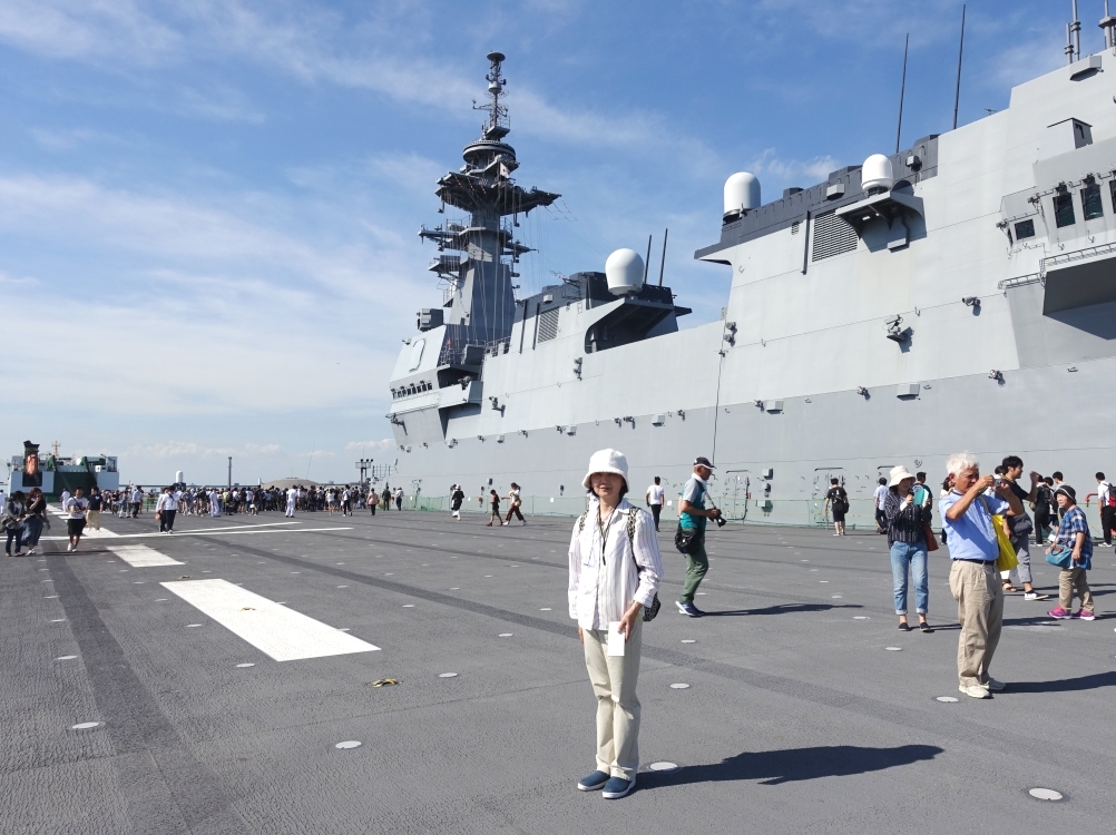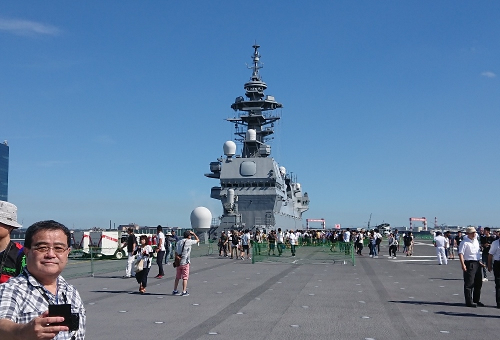 (10)記念写真(私)、右に見える窓はヘリの管制塔(船の後方側) |
