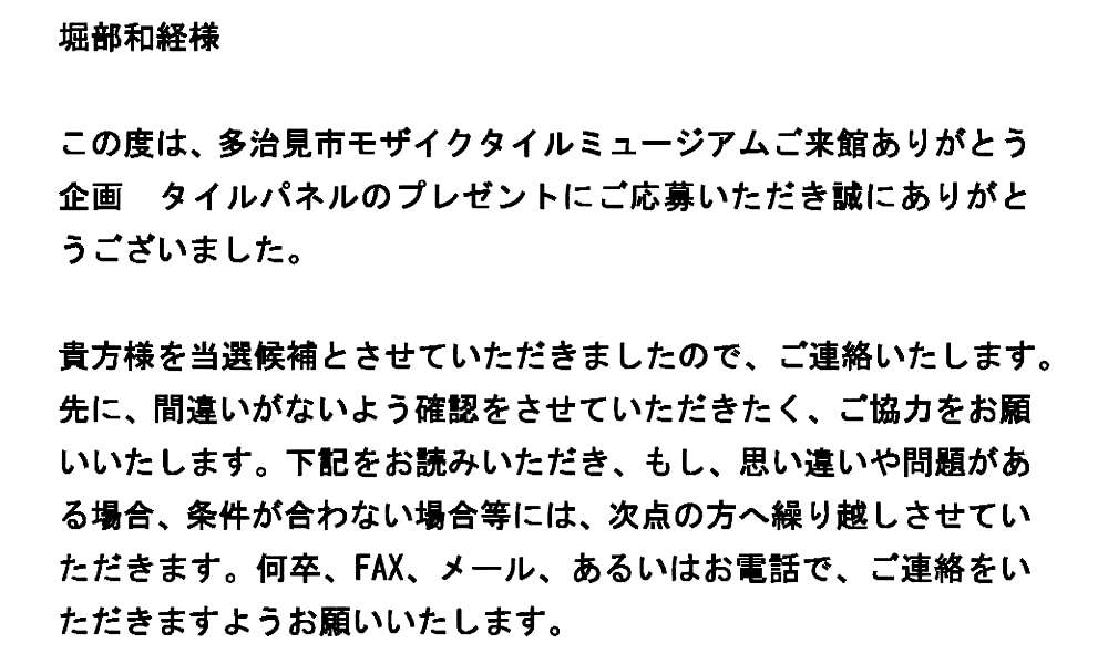(13)当選(候補)の連絡メール(一部)・・・・・・当然すぐに、取りに行く事を伝えました。 |