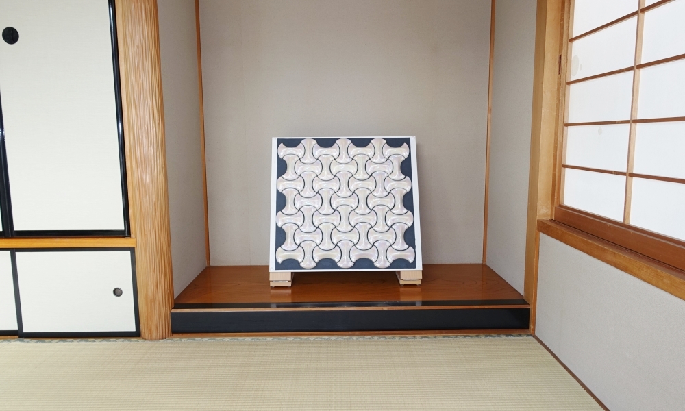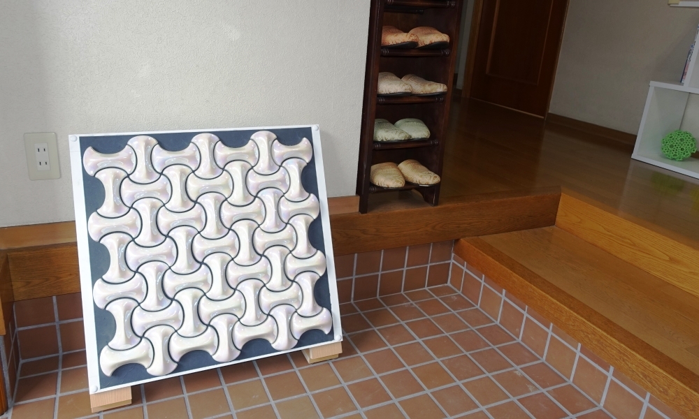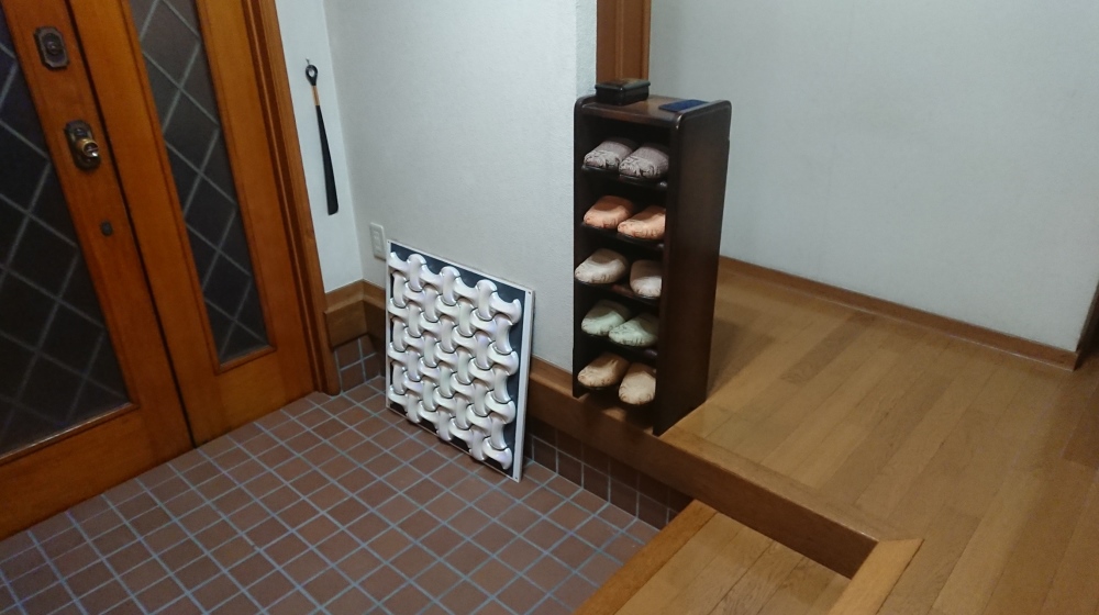 (15)玄関に仮置きした、タイルパネル(別角度) |