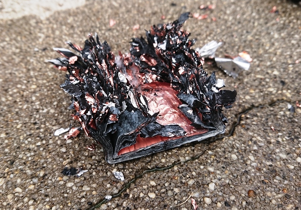 (8)ステンレスの水受けが悪くなるを避けるためプラの赤いバケツに入れて、庭に放置。 これで、温度上昇とか発火は、大丈夫でしょう。 |
