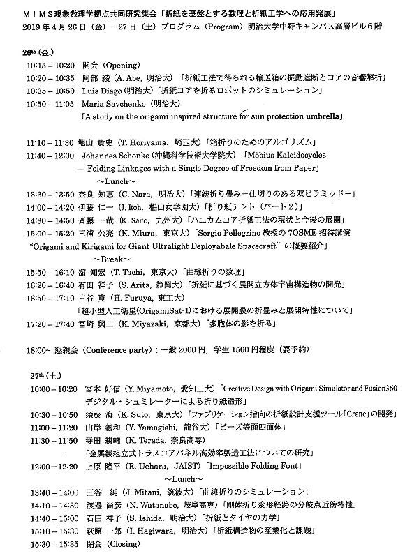 MIMS現象数理学拠点共同研究集会「折紙を基盤とする数理と折紙工学への応用発展」