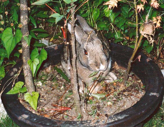 「プイ」が死んだ。3日間元気が無くて、おかしいなと思っていたが。手当のかいなく、死んでしまった。獣医さんにつれていったときは、どうも手遅れだったようだ。先生が、「これはいけませんよ。」と・・・。最後は、手足をばたばたとさせて、数秒で動かなくなってしまった。生まれたての赤ん坊から育てたウサギの「プイ」。約1年の命だった。5年は生きて欲しかった。明日は、早起きして埋葬をしてやらなくっちゃ。(右は、つい数日前の写真。庭にある一番大きな植木鉢の上にて)
