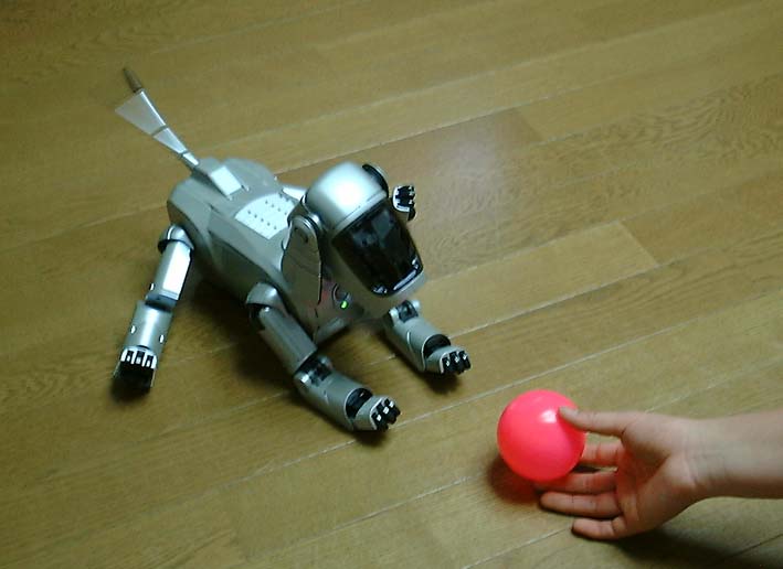 Aibo(名前はまだない)が初めてボールを追っかけるようなそぶりをした。具体的には、4本足で立って、とは言っても、まだよちよち歩き、とまでも、いっていないが、何とか立って、数歩歩くそぶりを見せた。