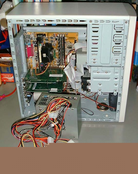 [電源部をはずした状態の、我が家のメインマシン(写真右)]