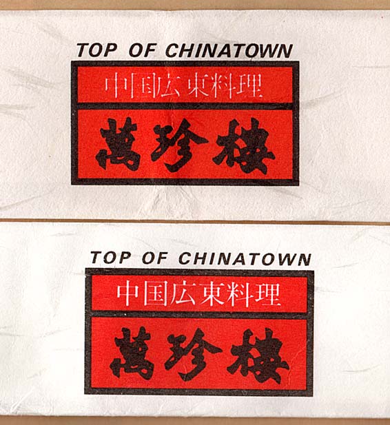 横浜・中華街の「萬珍楼」で夕食。ここには、ちょうど20年前に一度来た事がある。そのときの箸袋をスクラップしてあり、今回のものと比較してみる。上が1980年8月の箸袋の中央にある『ロゴ』で、下のものが今回つまり2000年8月のものである。ほとんど違いがない。ただ、詳細に見てみると、「TOP OF CHINATOWN」の文字と「中国広東料理」の文字の幅に若干の違いが認められる。しかし、老舗というもののすごさが、ここに現れている。『変化がない』ことが、すごい!!!
