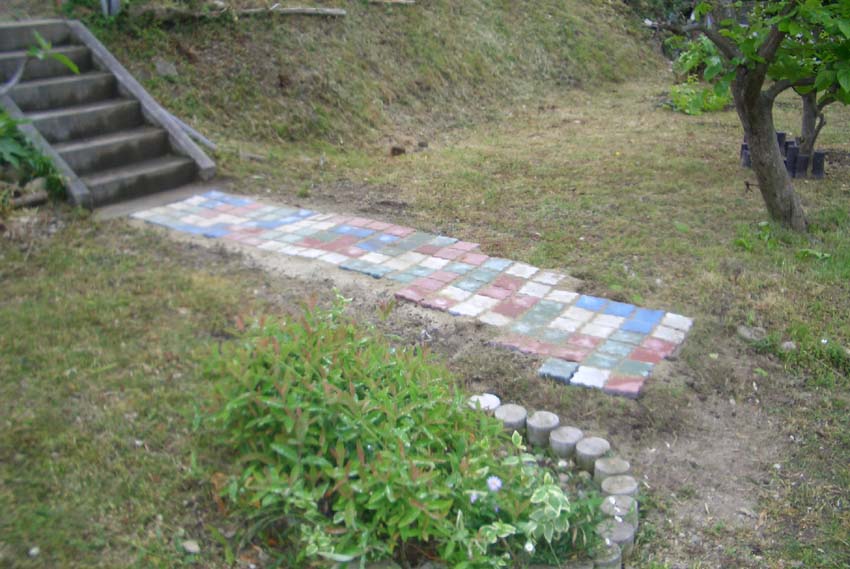 午後、2人の娘の手伝いで、上の庭にブロックの通路を造る。