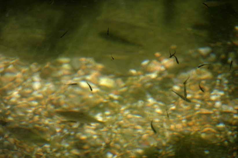 写真は、先週池に放した、稚魚。死なないで定着してくれたようだ。60匹ぐらいが泳いでいる。(^_^)v