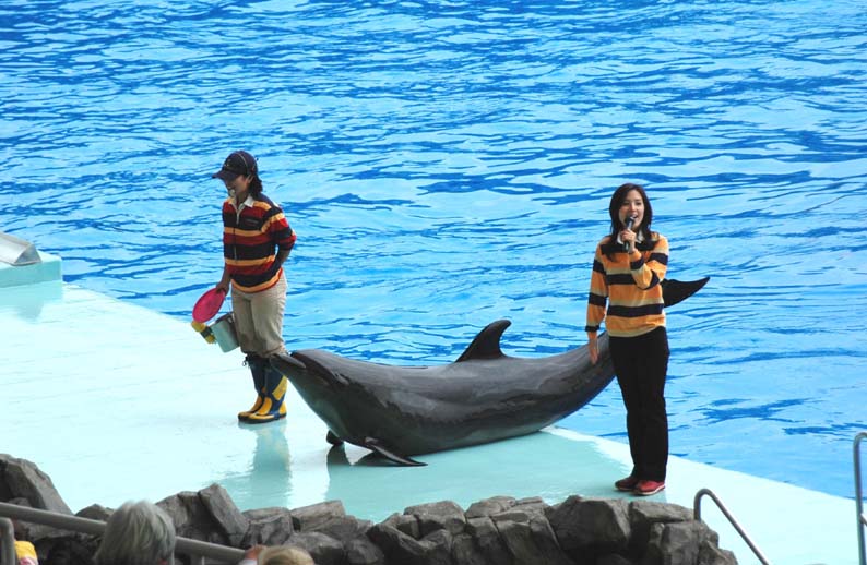 ちょうどお昼時になったので、ホットドックを買い、イルカプールで食べる。