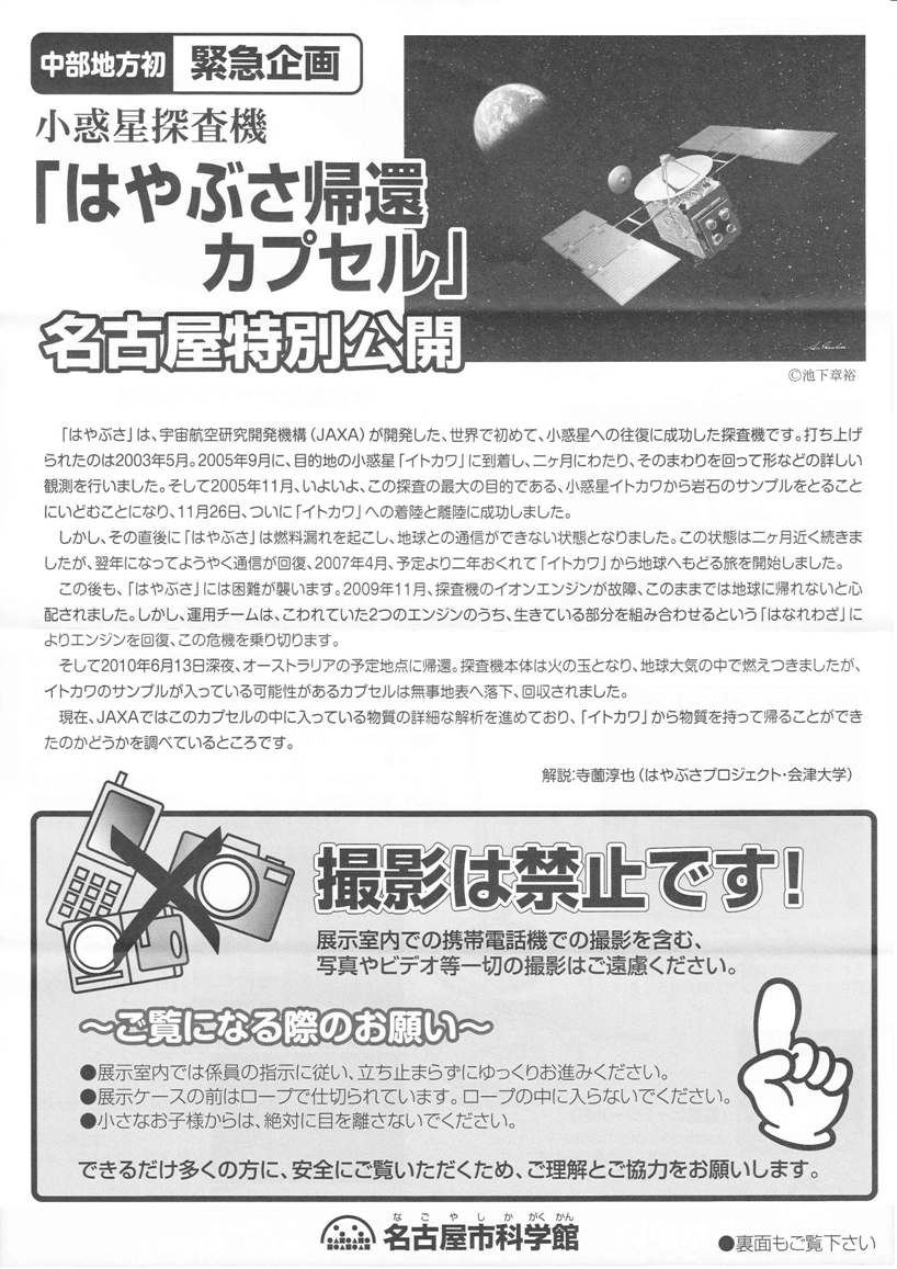 「MUSES−C/はやぶさ」が名古屋市科学館で展示されている。
