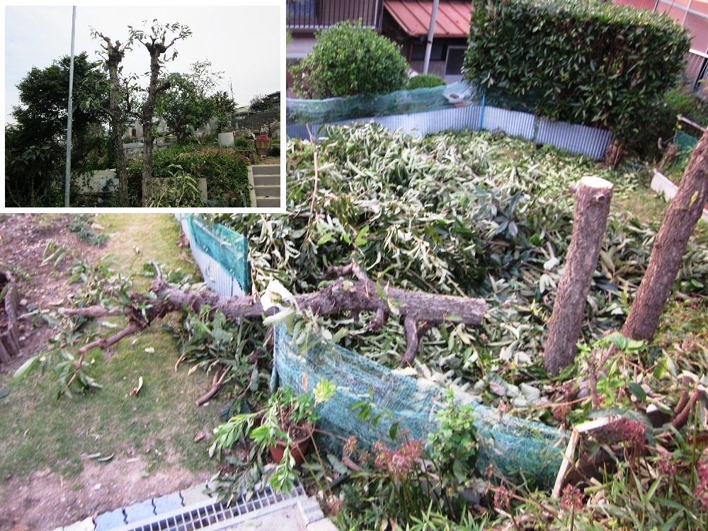 そして、娘が2本のうち1本の幹を真ん中から切り倒す。
