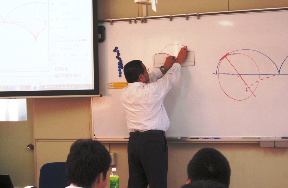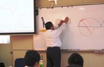 内容は、「互除法」と「無理数の有理数近似」について、(写真:連分数展開を話しているところ)