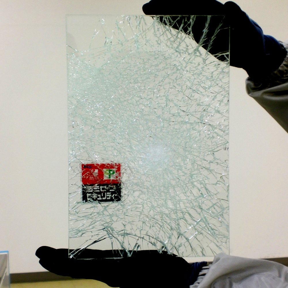 (1)普通のガラス(2)網入りガラス(3)ラミセーフ,と割った。