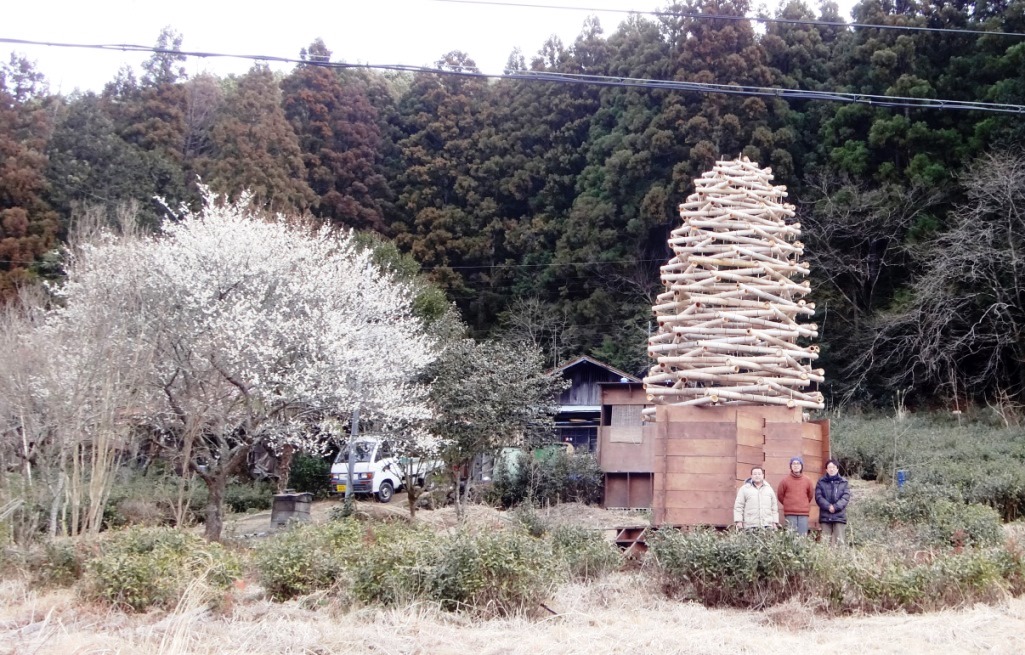 家の前のフィボナッチタワーの前で,三人で記念写真。