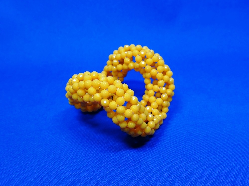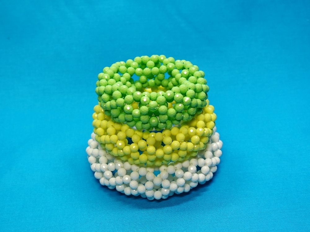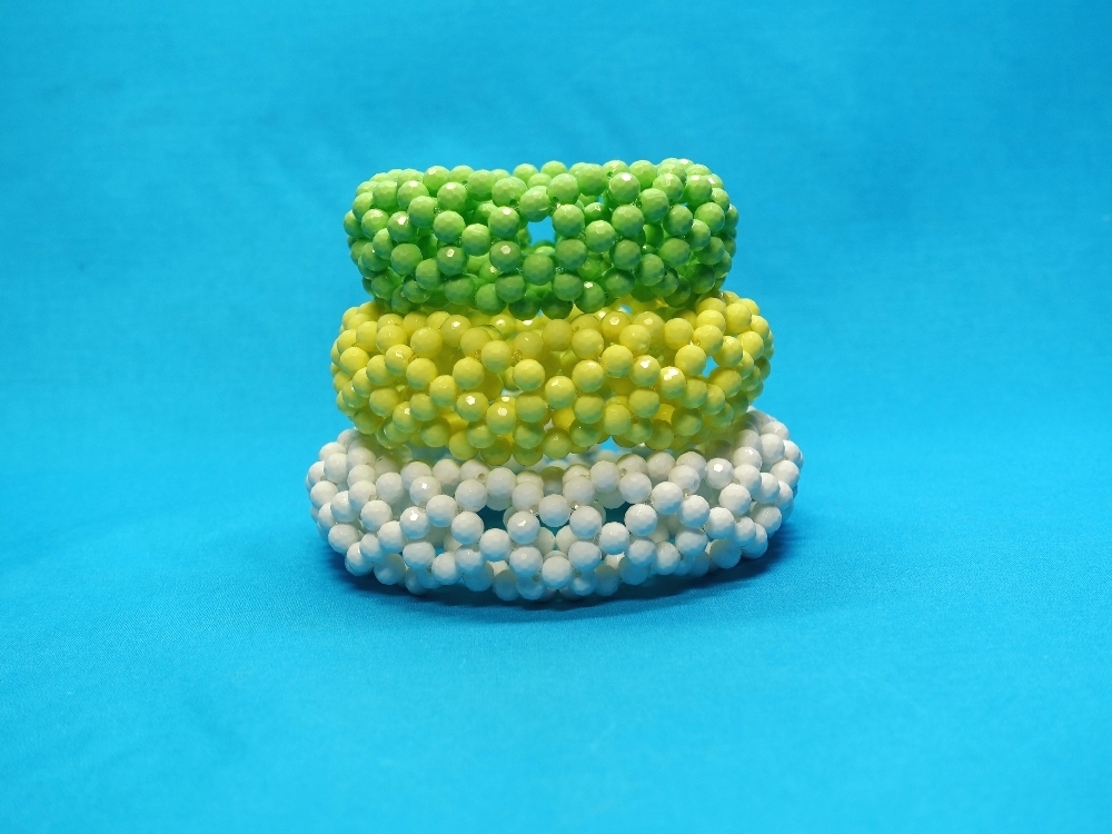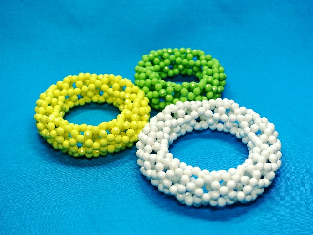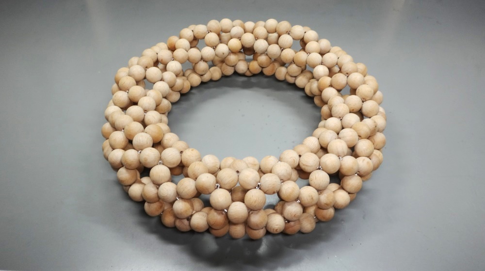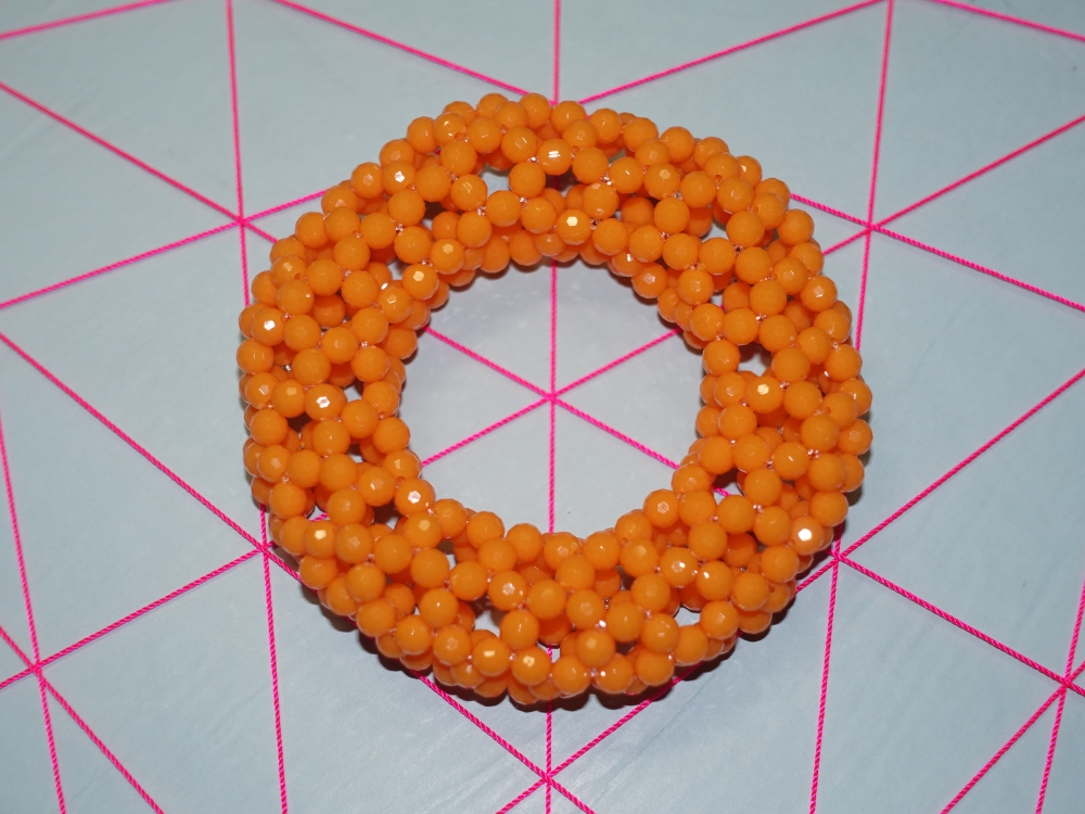 昨日、M本さんから頼まれた336個の木製のリングビーズ編みのゴムが切れたとのことで、テグスに張り替え。
