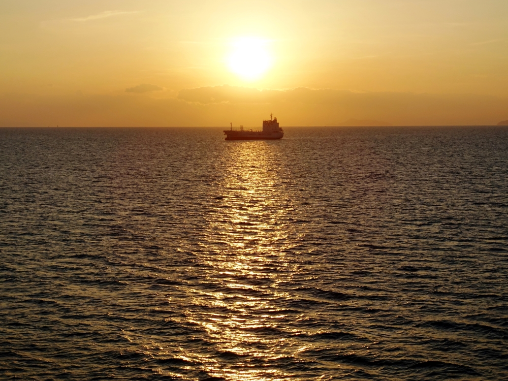 写真は乗船する「サンフラワー・アイボリー」と「夕食前の乾杯」。