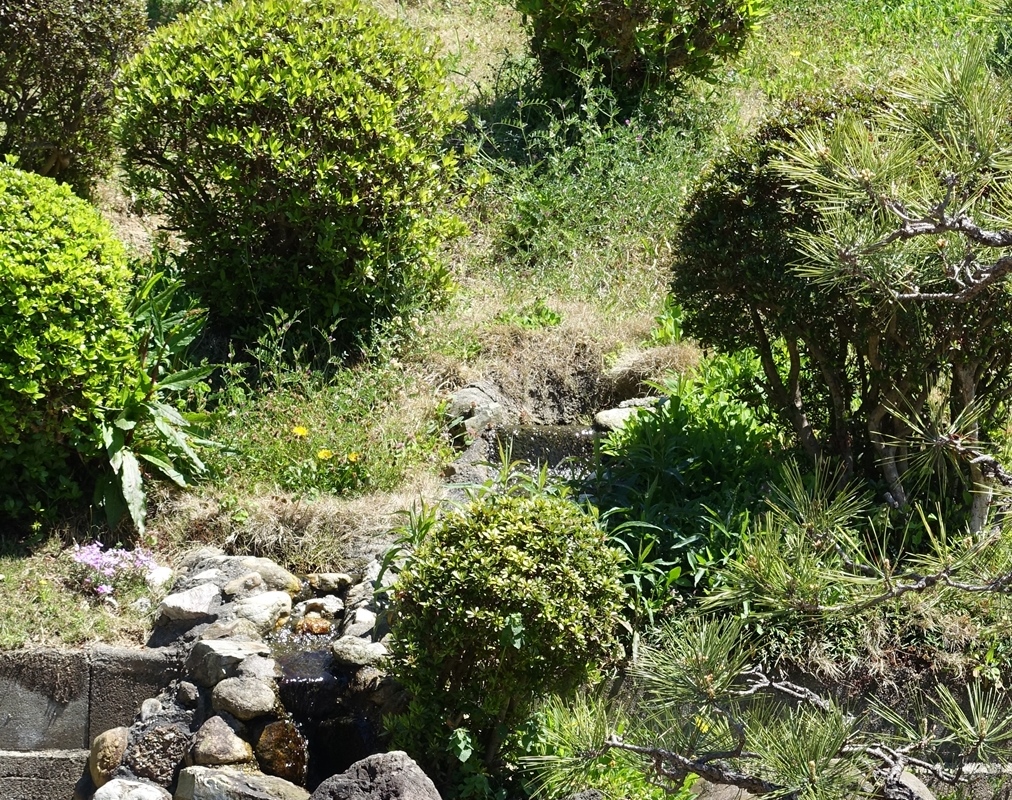 庭の滝の一番上の水の出口をすこし触って、今までの所より少し高い位置から、「落水」。