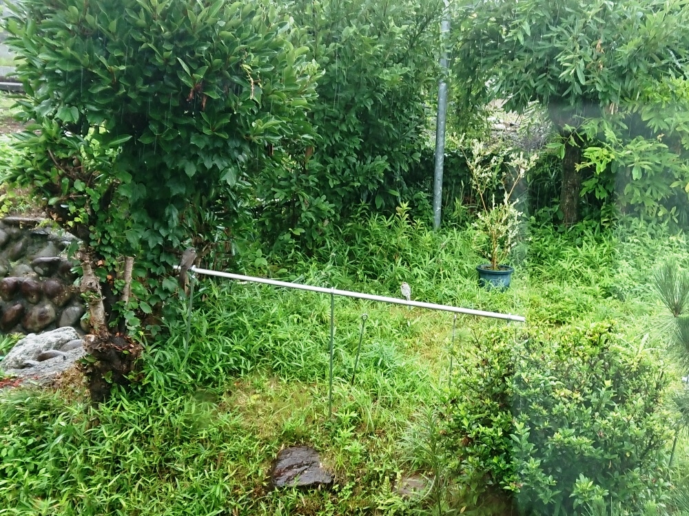 写真は、7/5の朝、寝室から見えた鳥2羽、・・・手すりの左端と、右側の真ん中あたり。