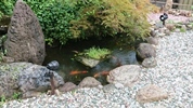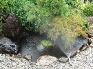 降り始めるときの写真、池の真ん中の石に、ポツリポツリと雨の跡が・・・。