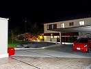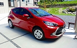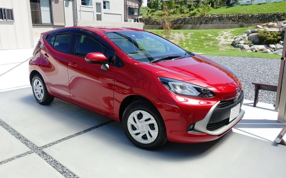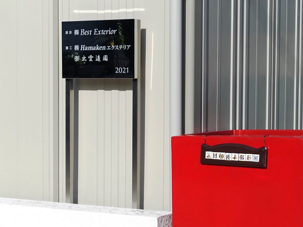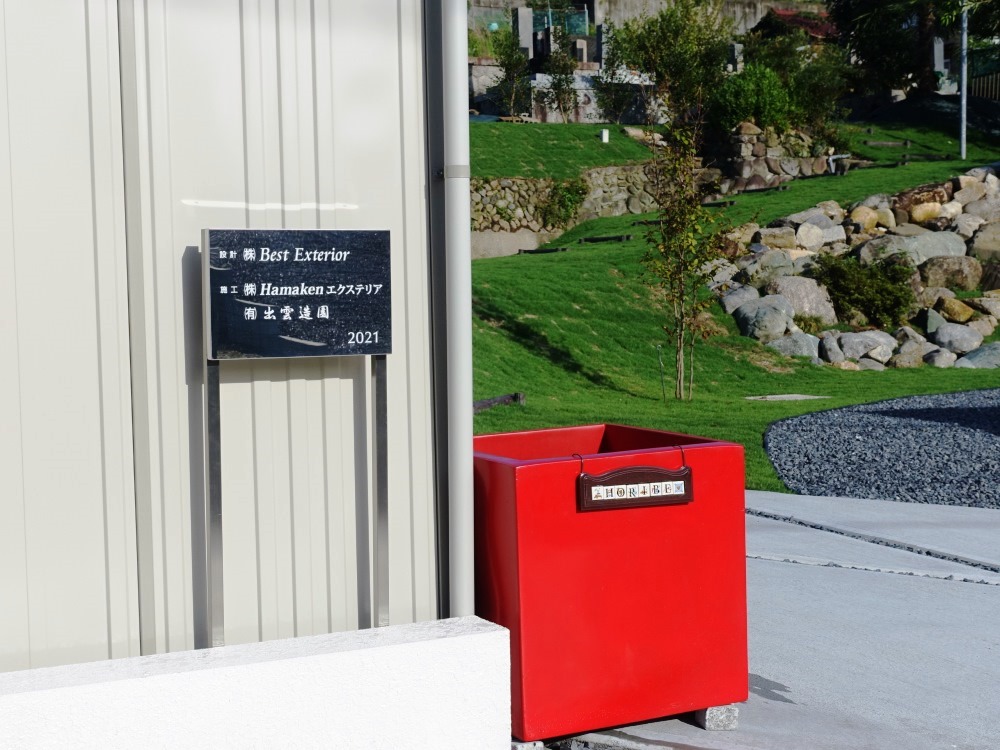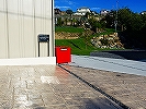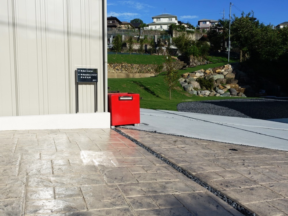 赤いプランターと、車止め(ステンレス製パーキングブロック)茶色・・・見えるかな・・・。
