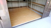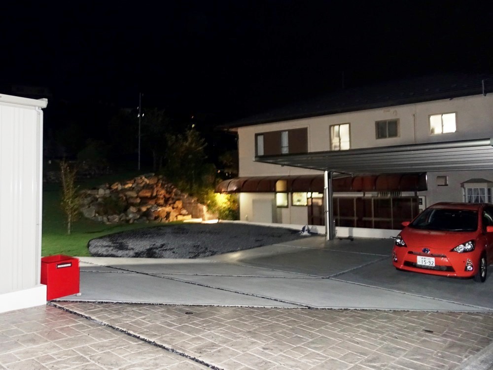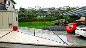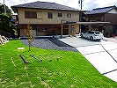 ほぼ完成した駐車場と物置小屋と奥の庭。