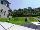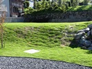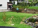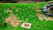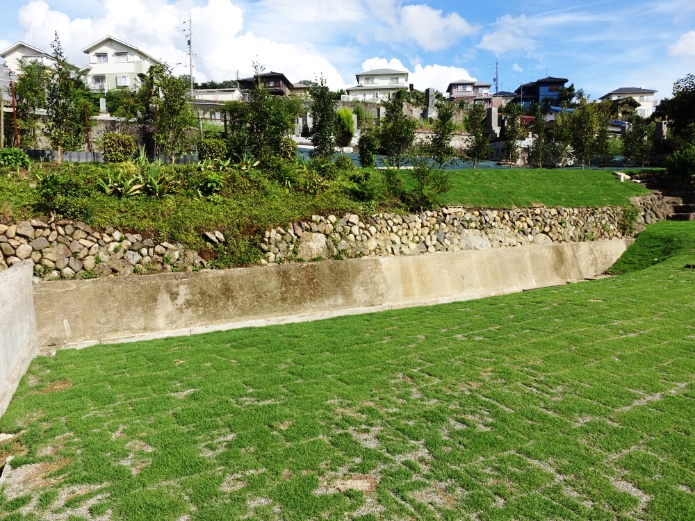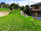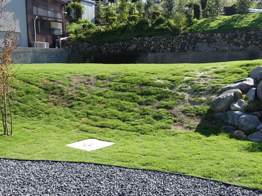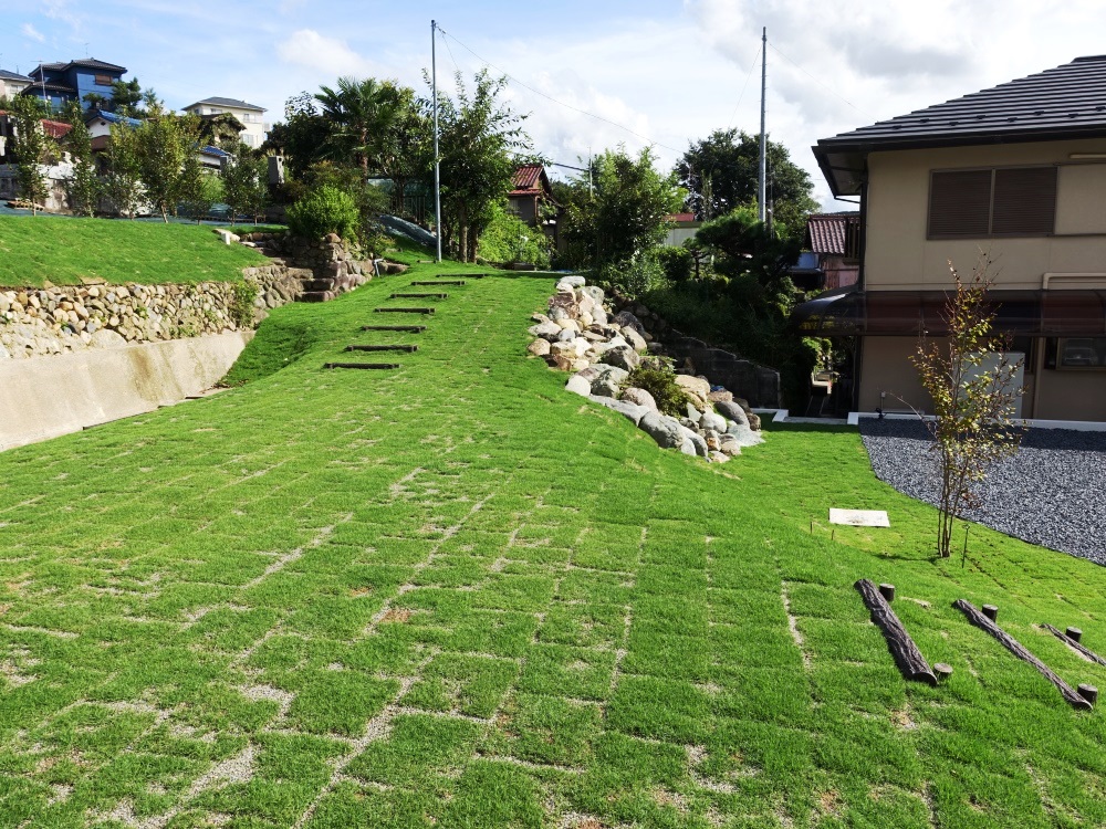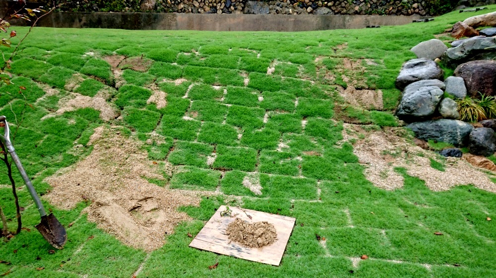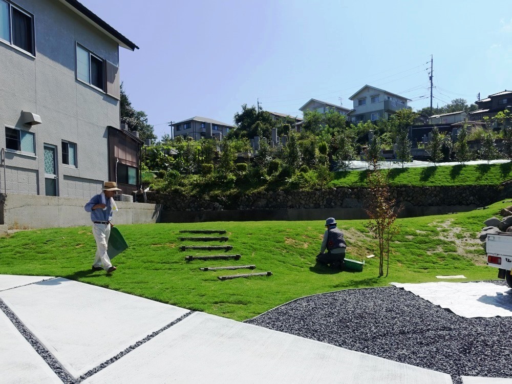 出雲造園の2人で芝のメンテナンス、斜面の形状を戻す作業