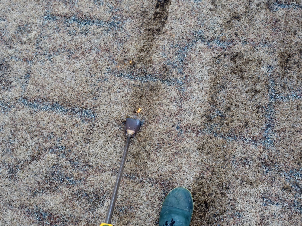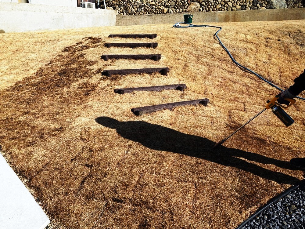 燃え広がったらどうしようかと心配し、水を30cmの幅で撒いて、防火帯を作っておいて1カ所ずつ燃やそうと思ったら・・・。