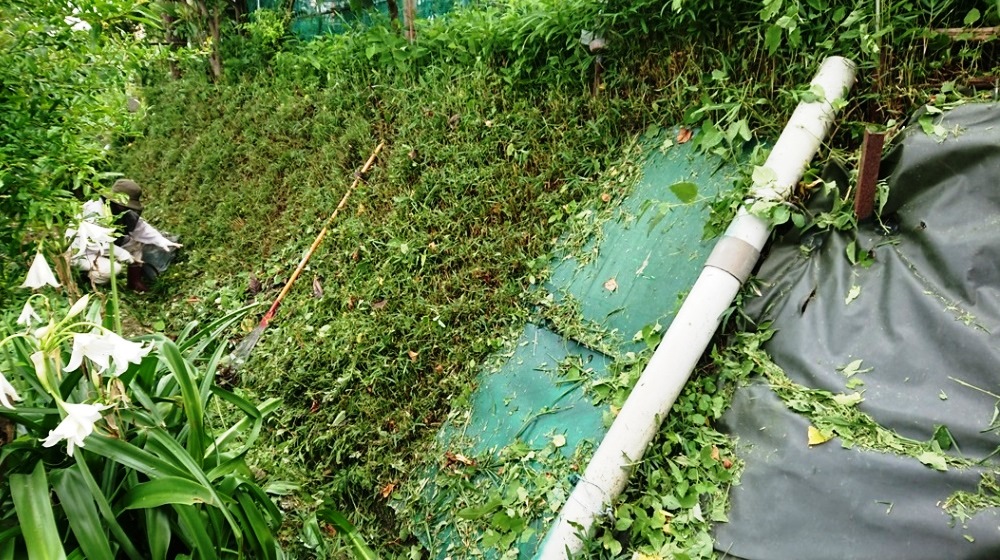 1・3枚目が除草前、2・4枚目が除草後の仕上げ作業中