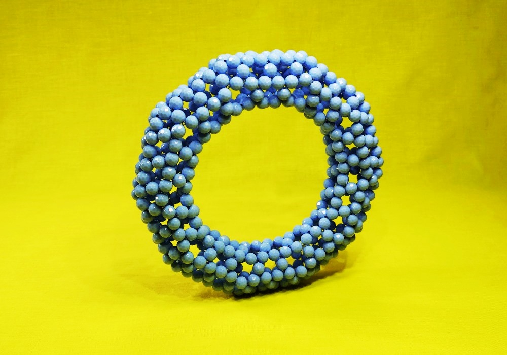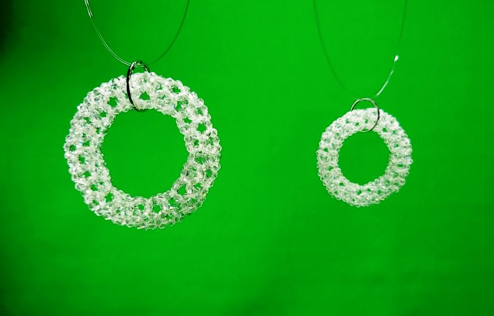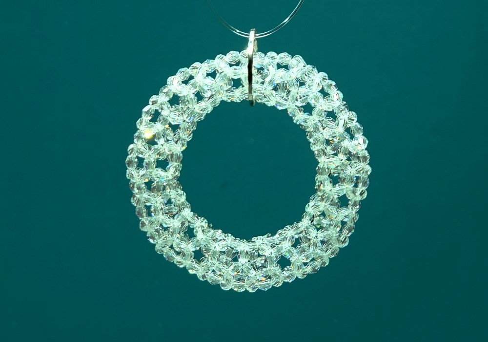 約30年前に考えた336個のリング、初めてスワロフスキーの3mmで編んだ。