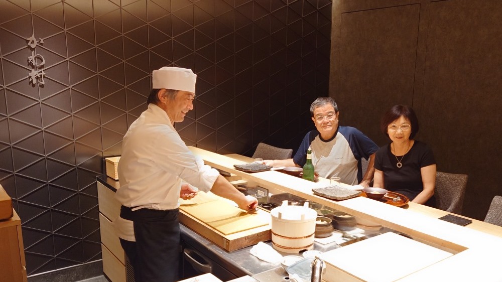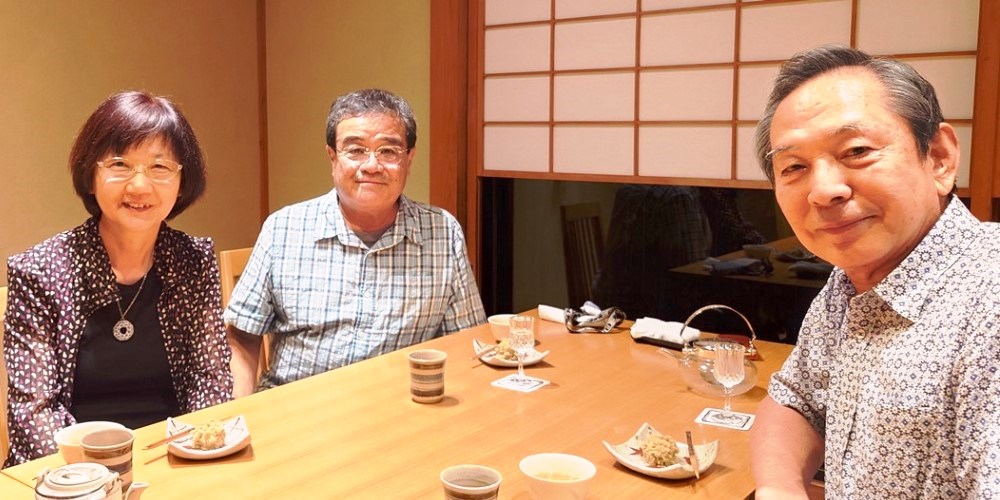 左から、妻(京子)私(和経)愛岐商事・会長の梶田さんと多治見市池田「日本料理 水野」にて
