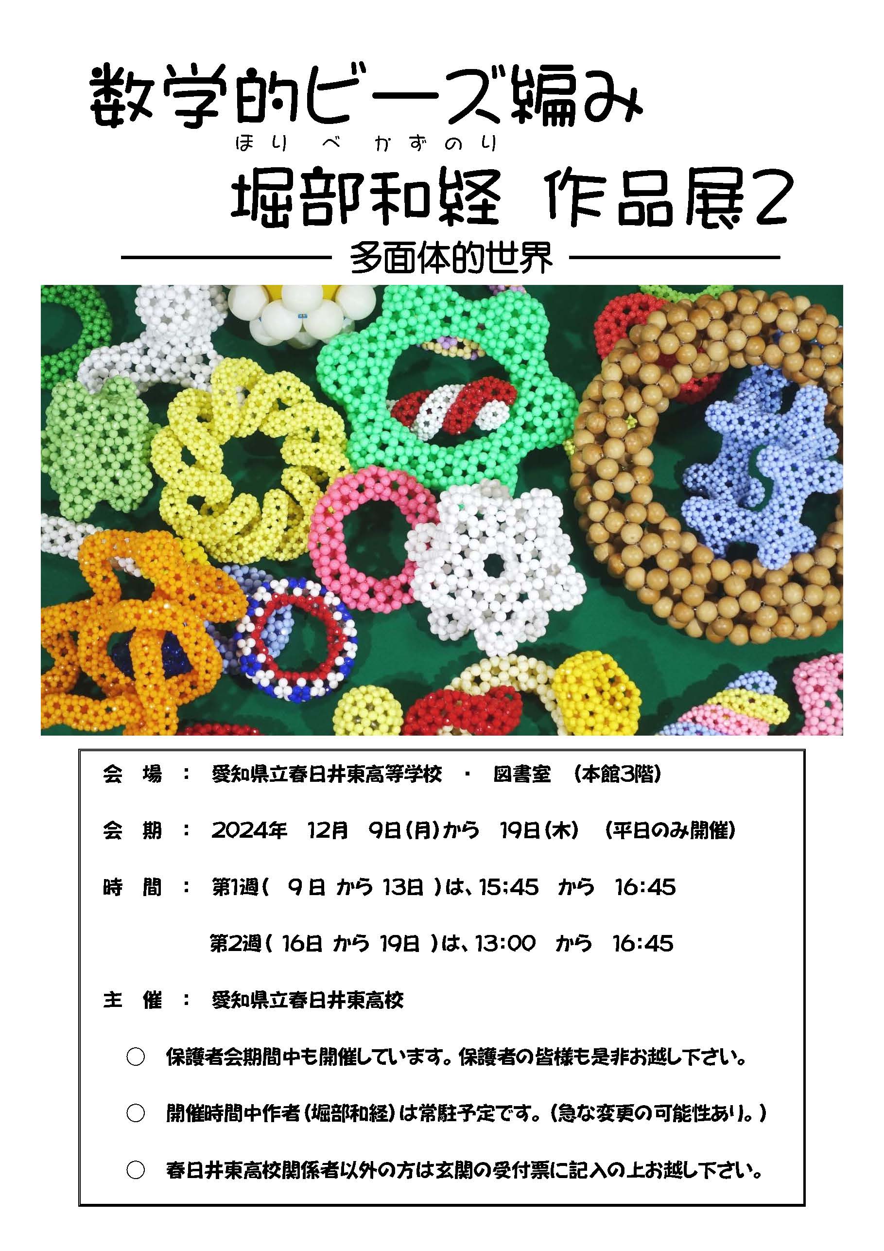 東高校での「数学的ビーズ編み堀部和経作品展2」が本決まりになった。