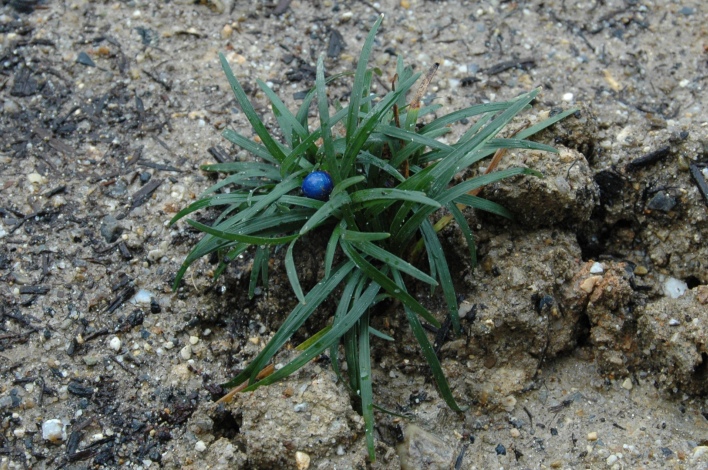 建物廻りに植えた「玉竜(たまりゅう)」のアップ・・・撮影の日には、青色の綺麗な実をつけていました。 実は、この実を最初見たときは、プラスチックのボールが落ちていると思ってしまいました。(>_<) |