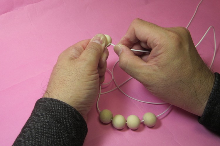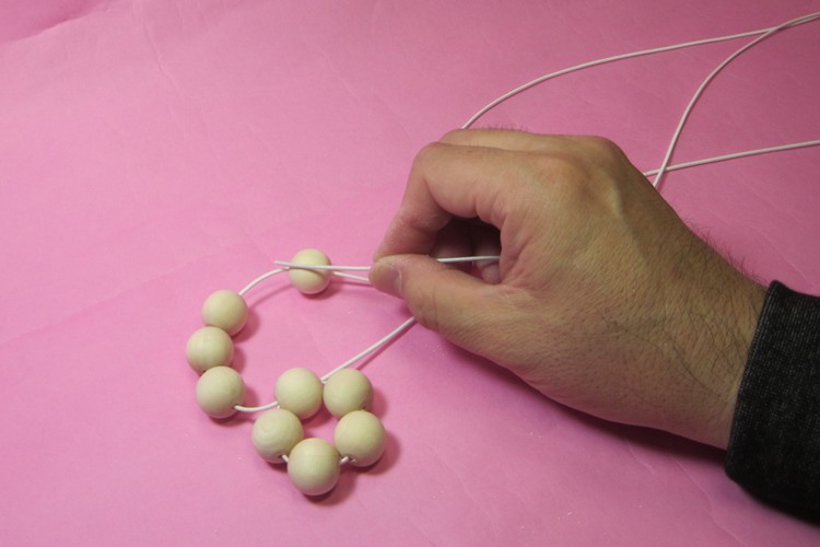 Finally, see that a pair of elastic cord braid passes through every wooden ball. (If not, go back to the point without fail.) | |