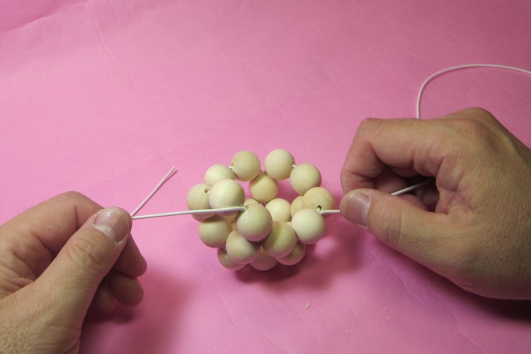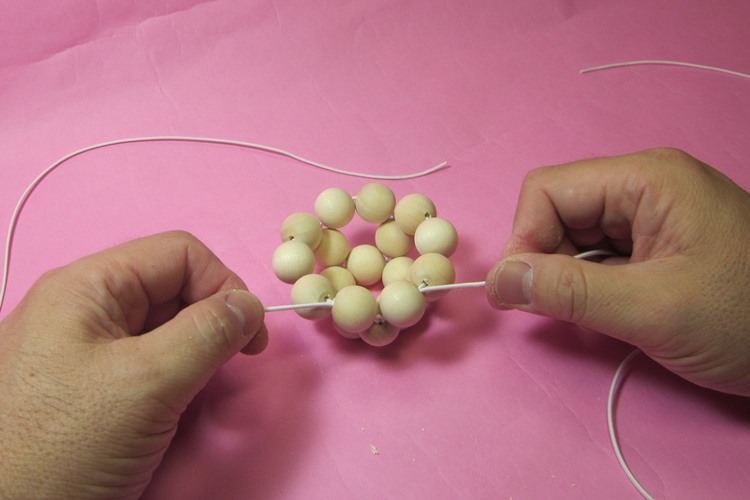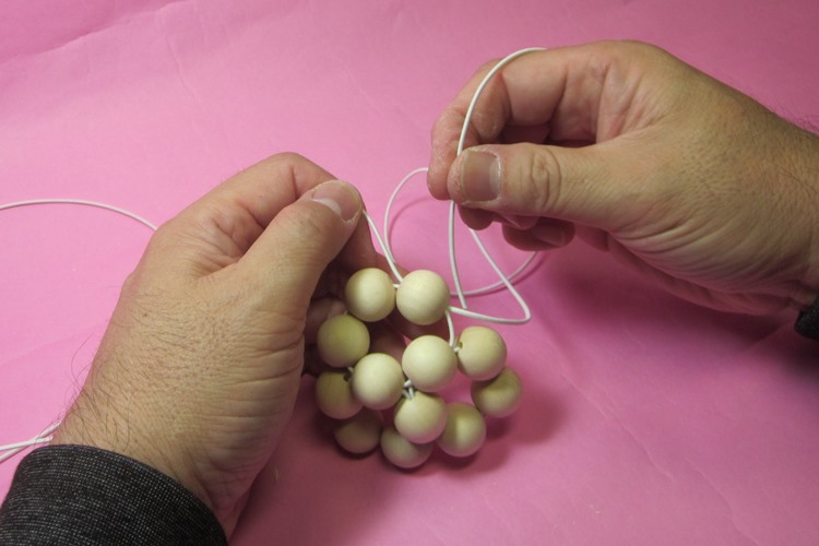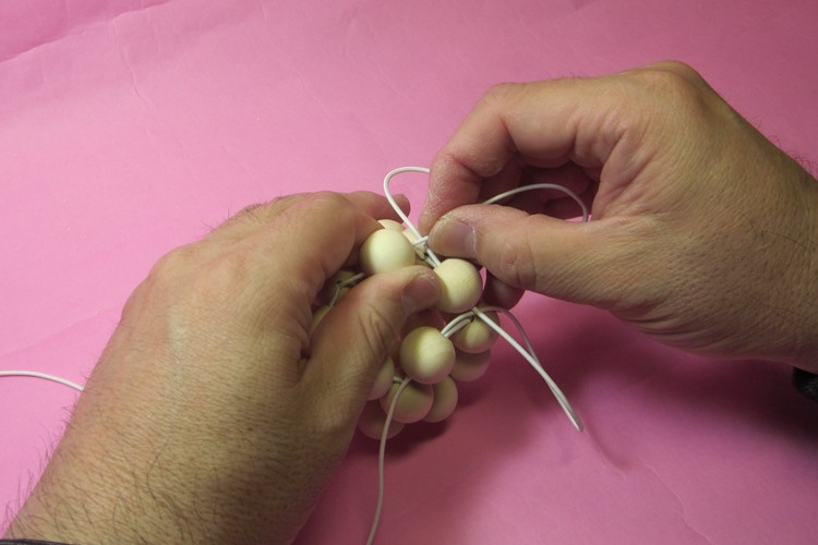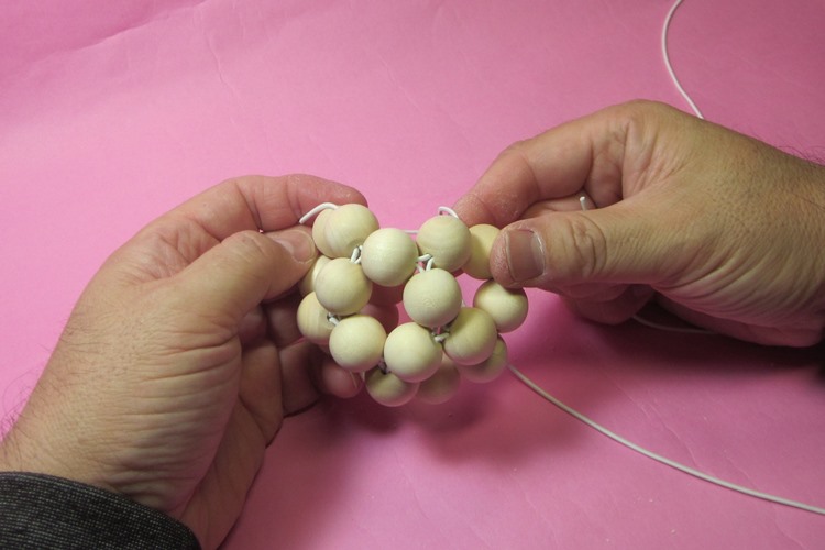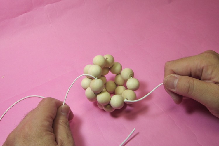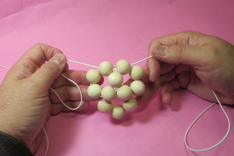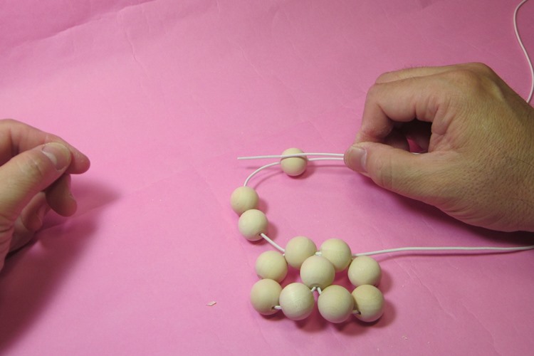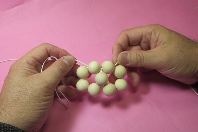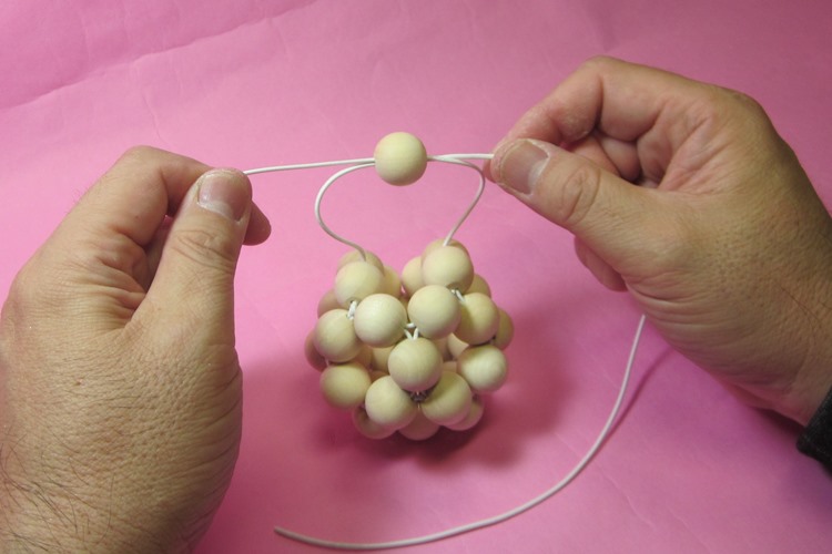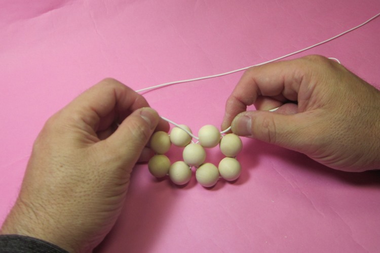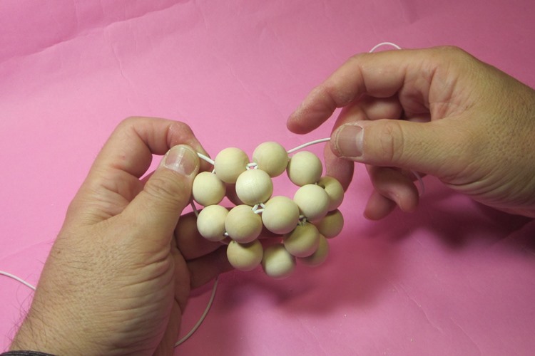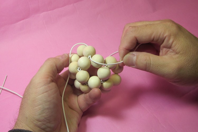 Thread the first five-ball ring with the other tip of the same cord so that a Y shape can be made at the intersection of the three balls.