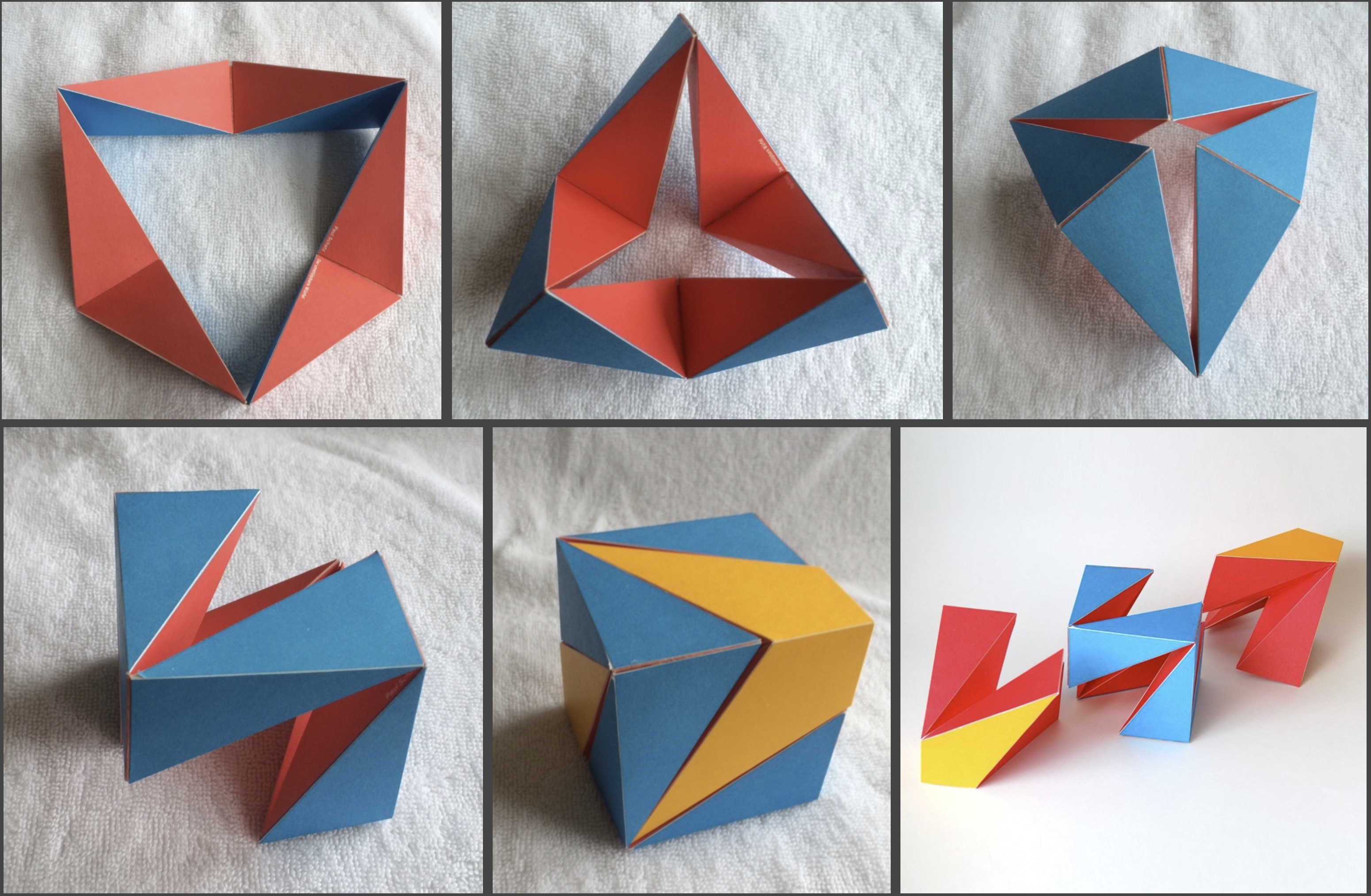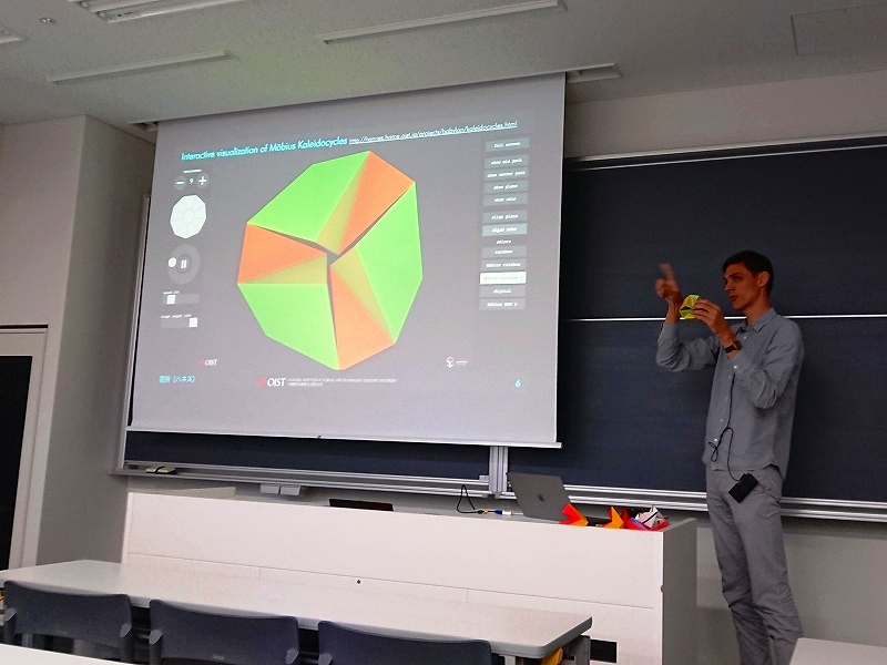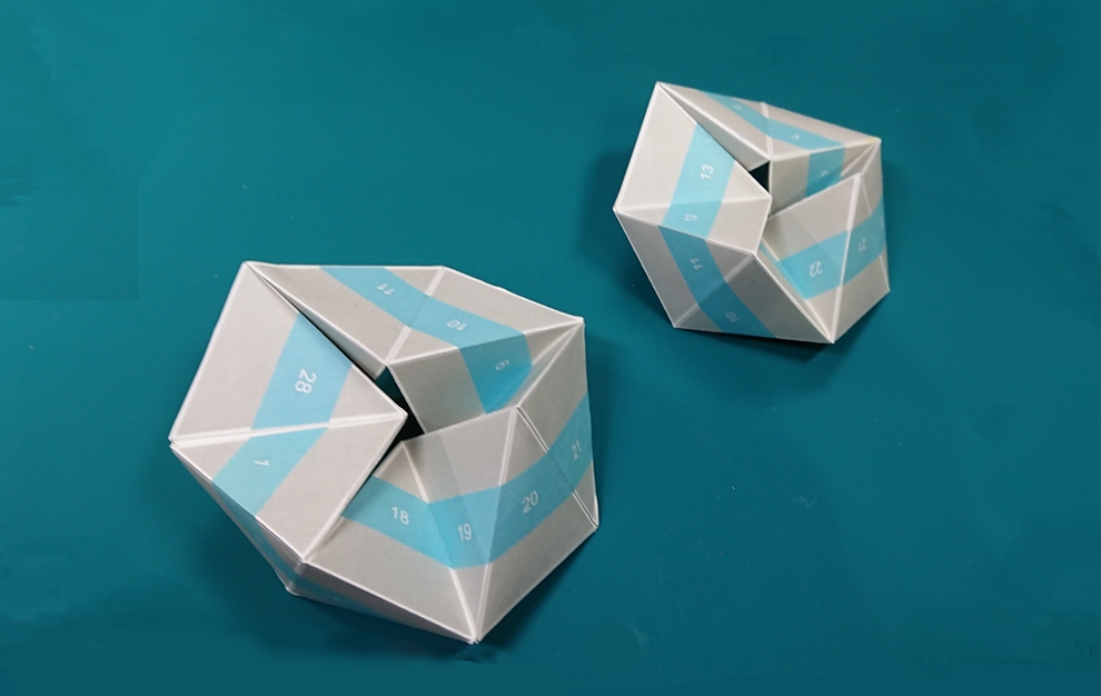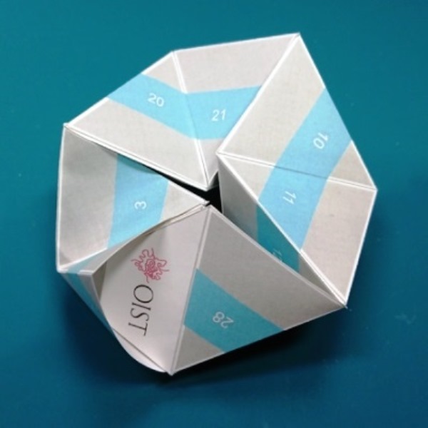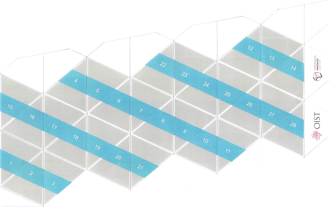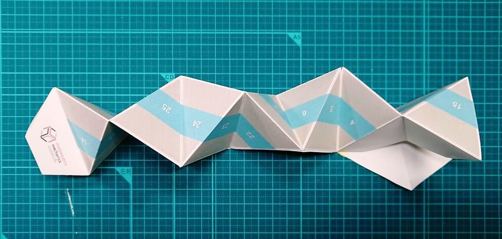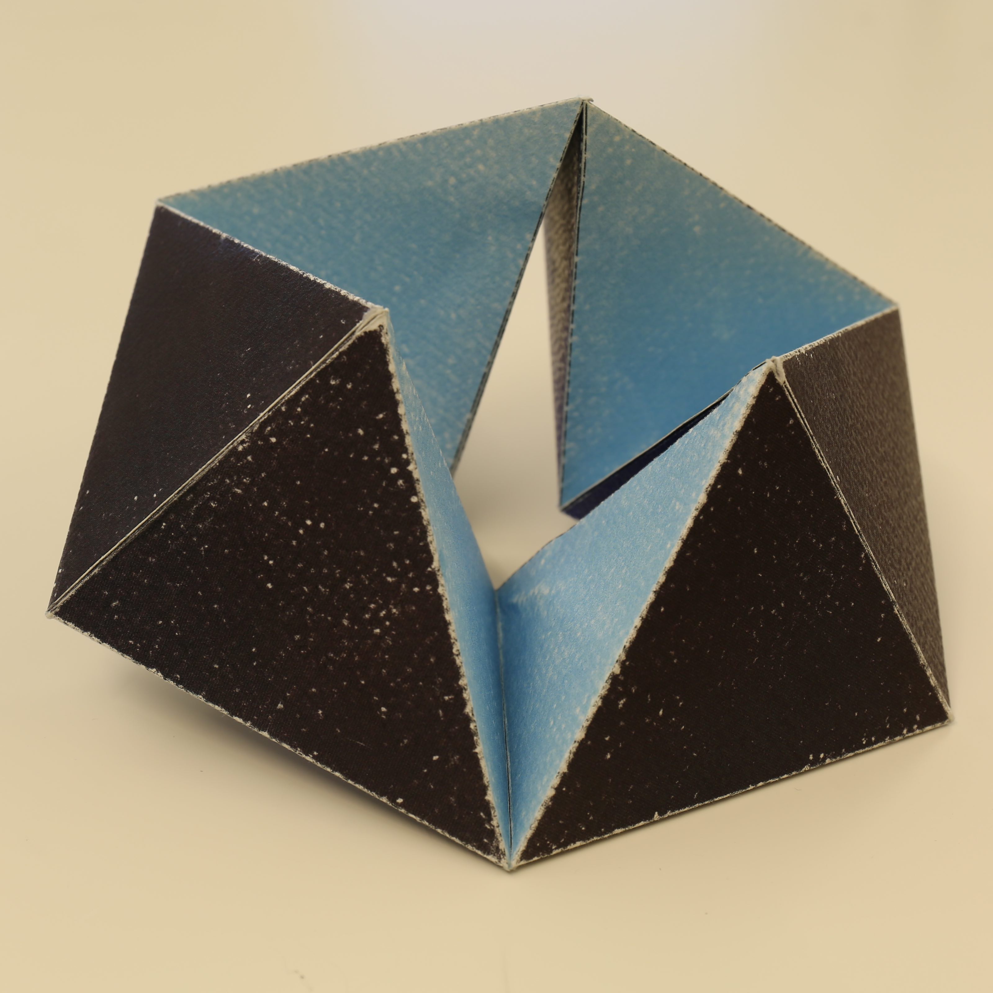 Nine-hinged Möbius Kaleidocycle mobile sculpture suspended from the ceiling at OIST