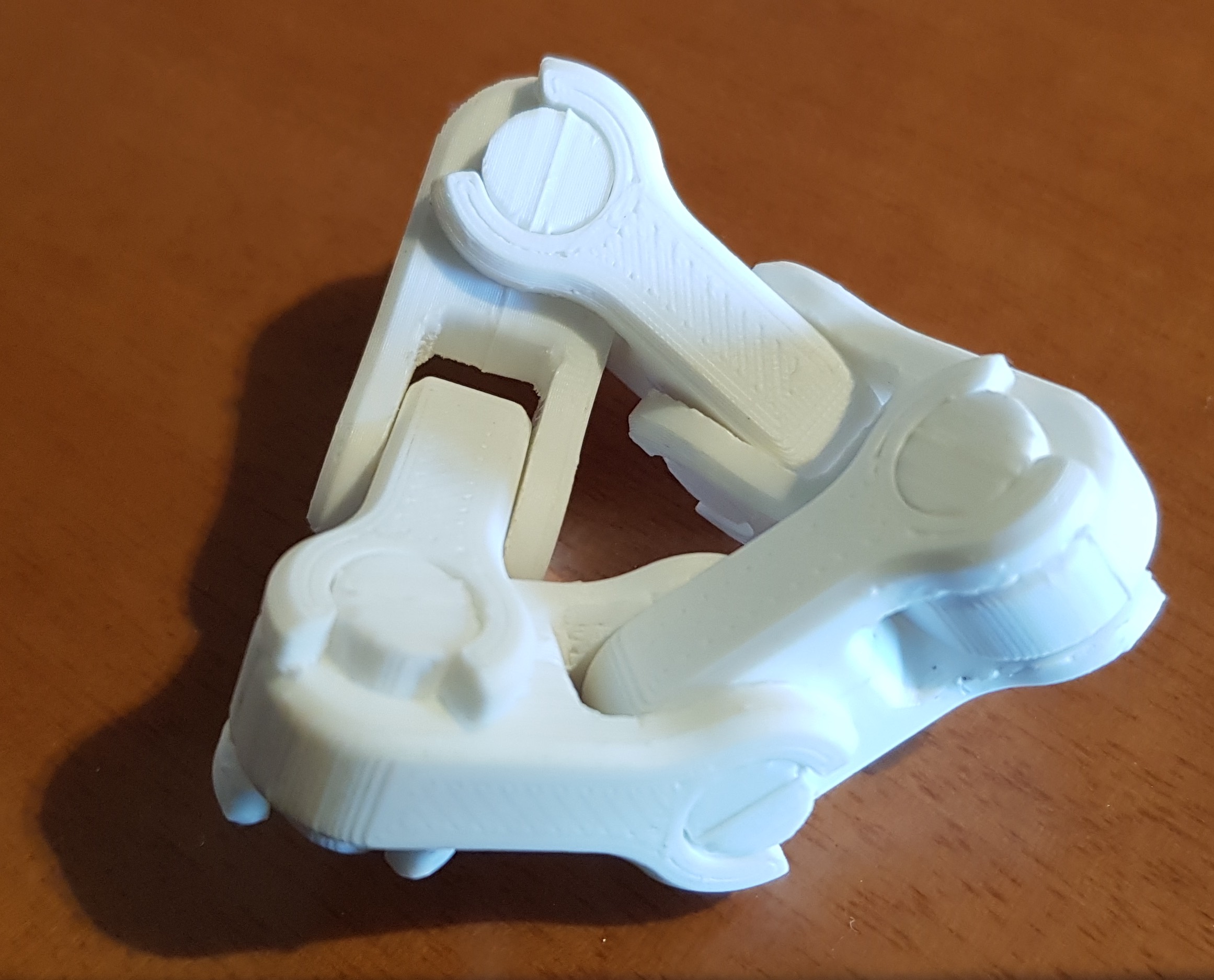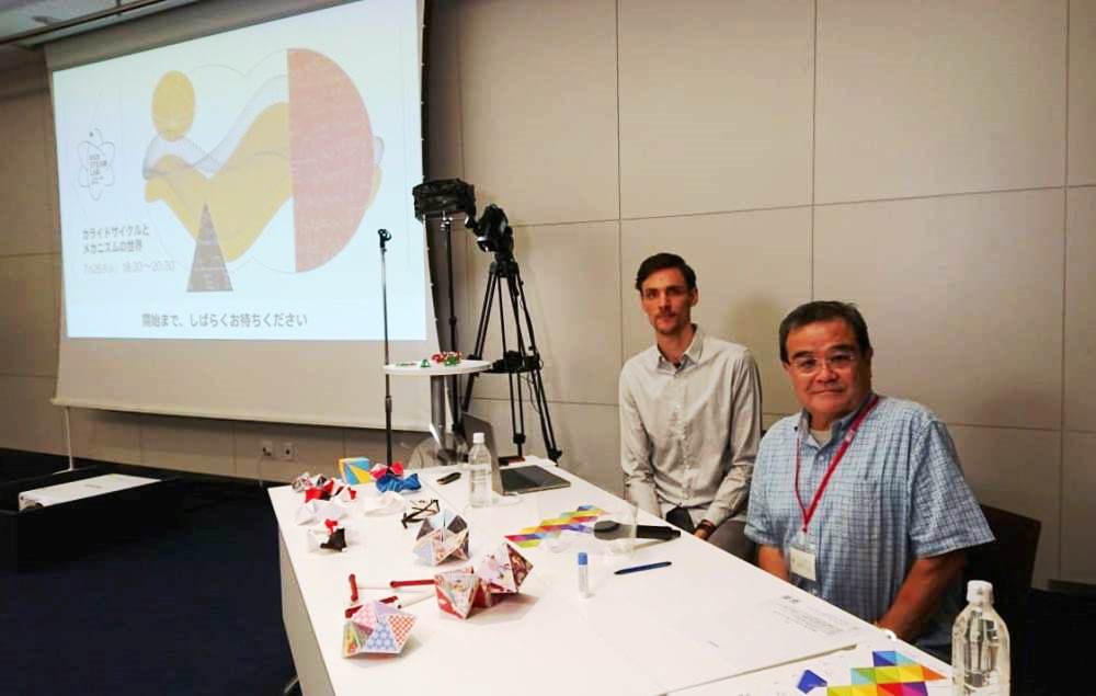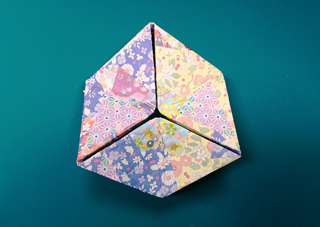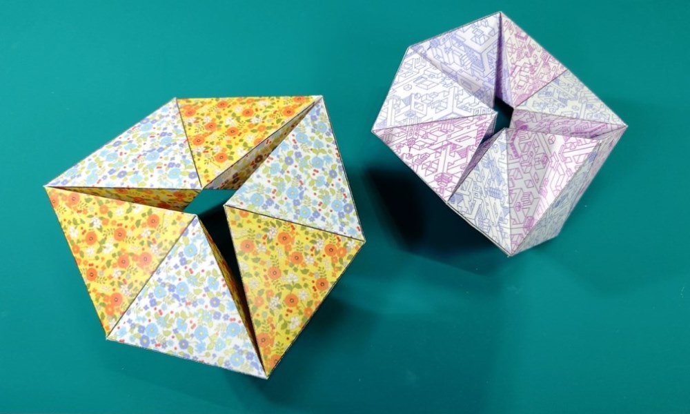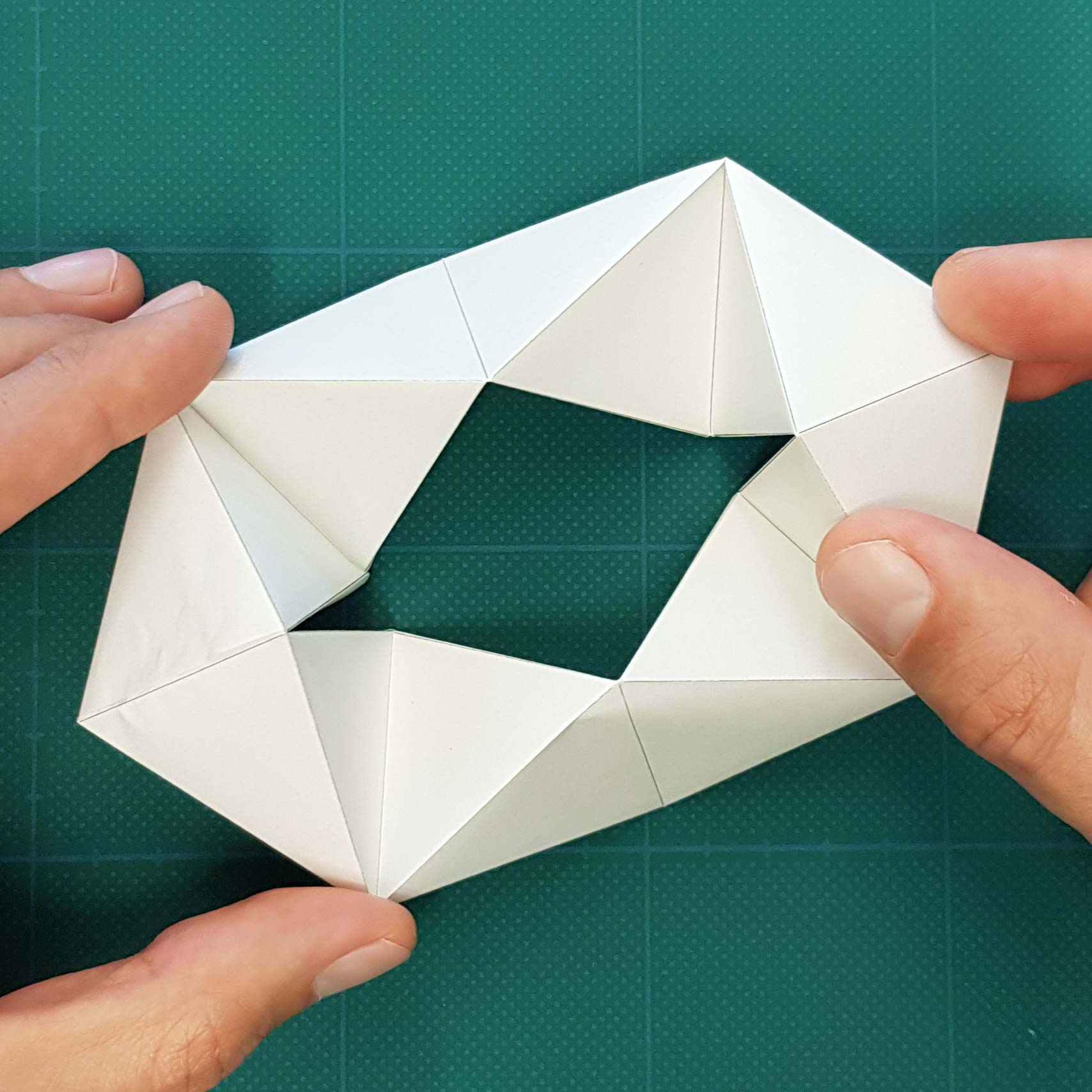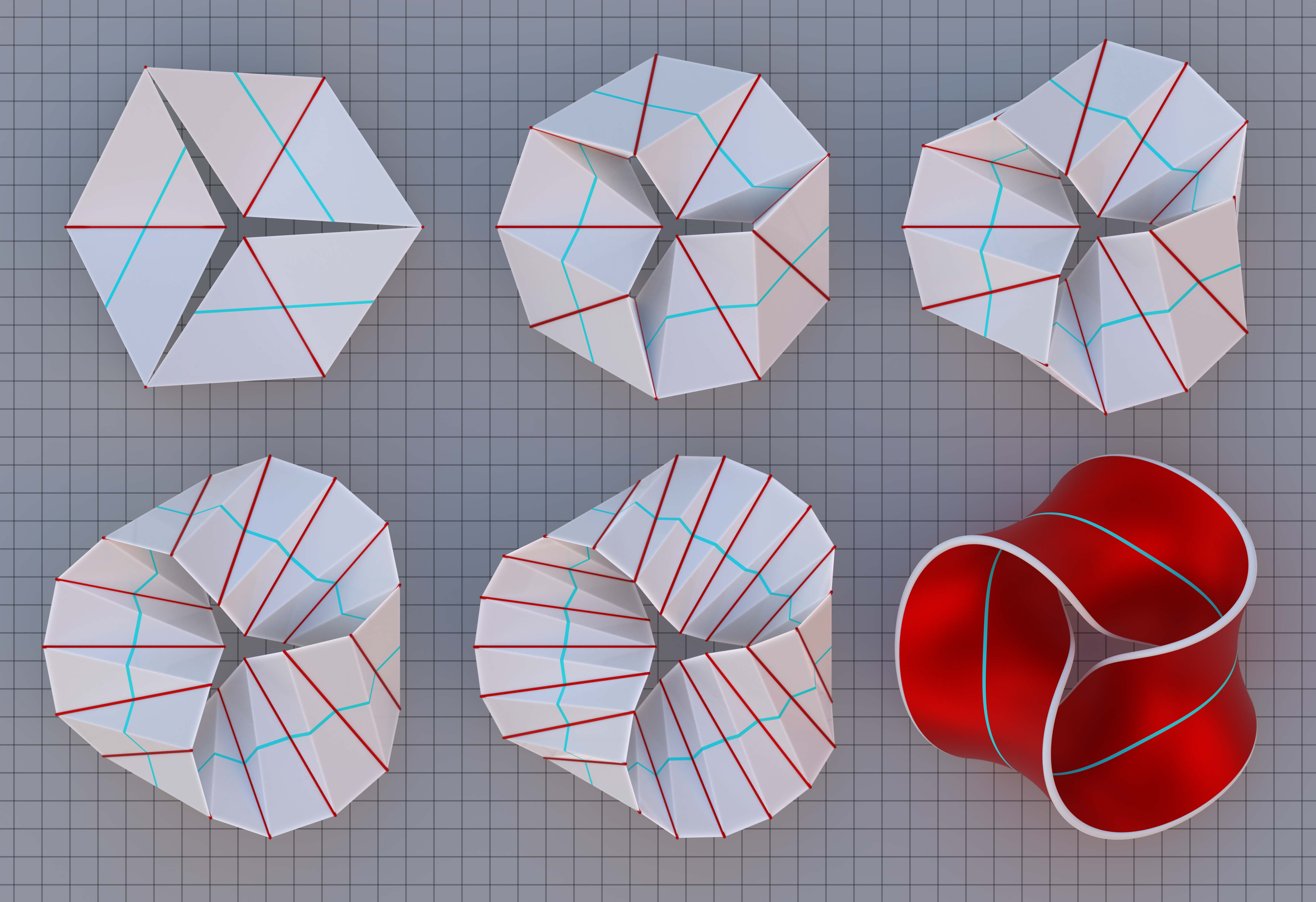 Nine-hinged Möbius Kaleidocycle mobile sculpture suspended from the ceiling at OIST