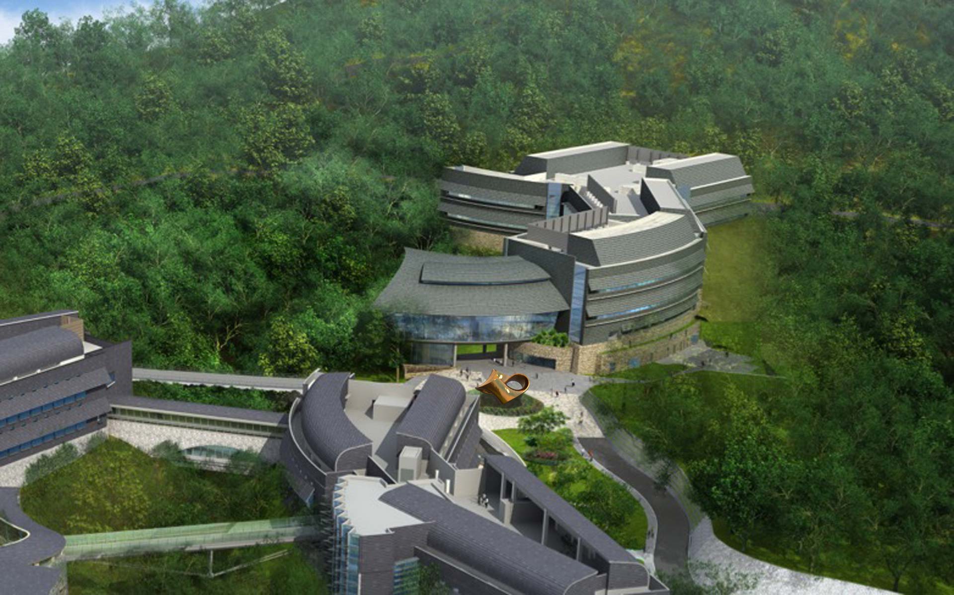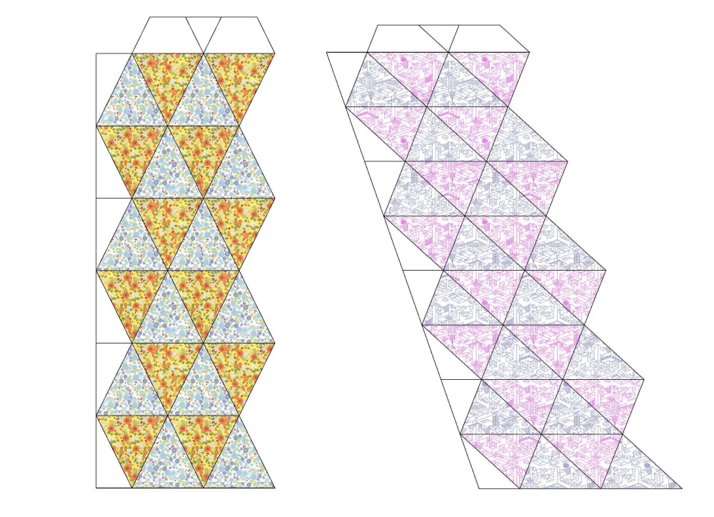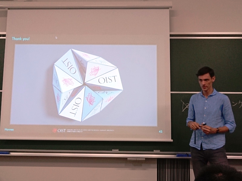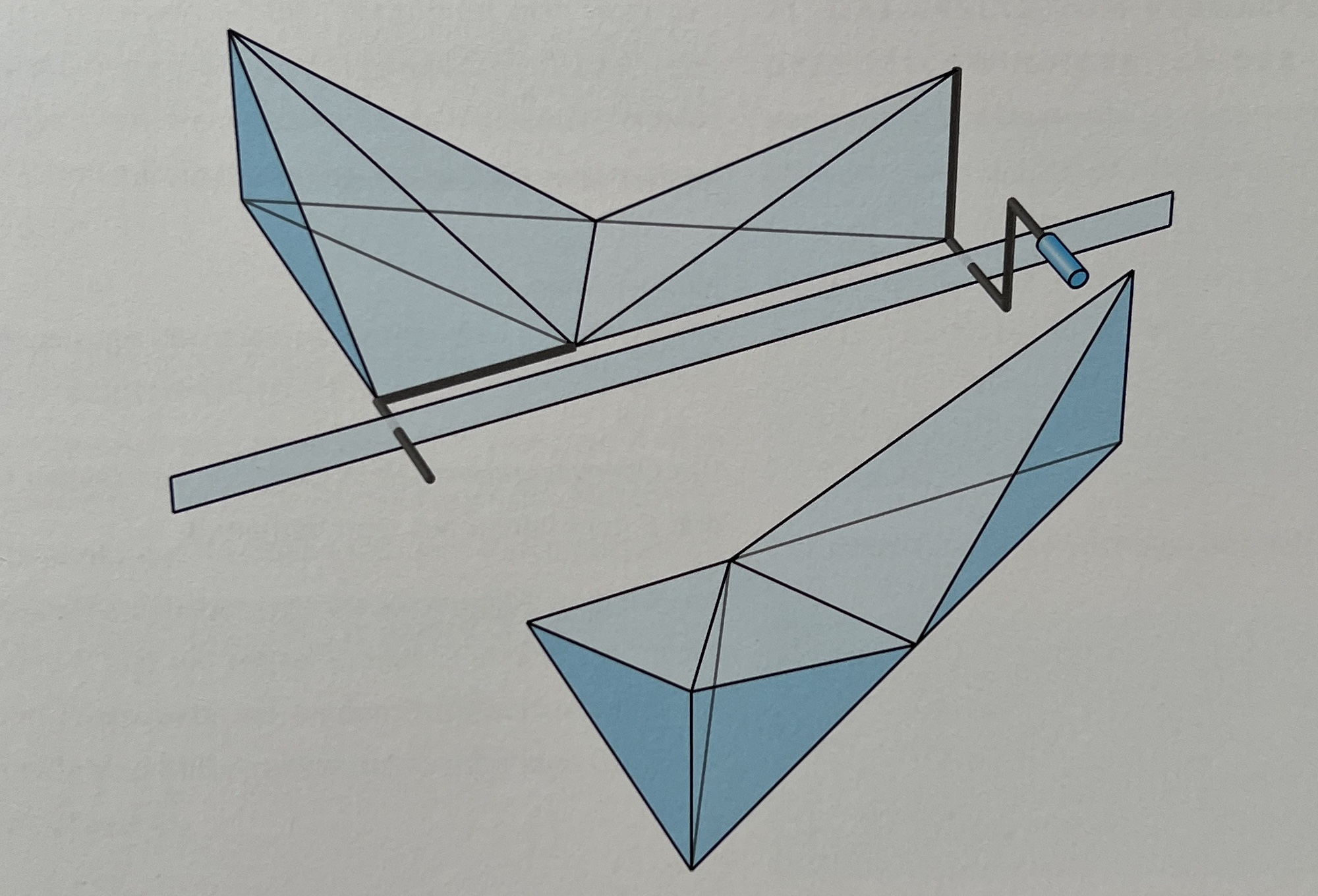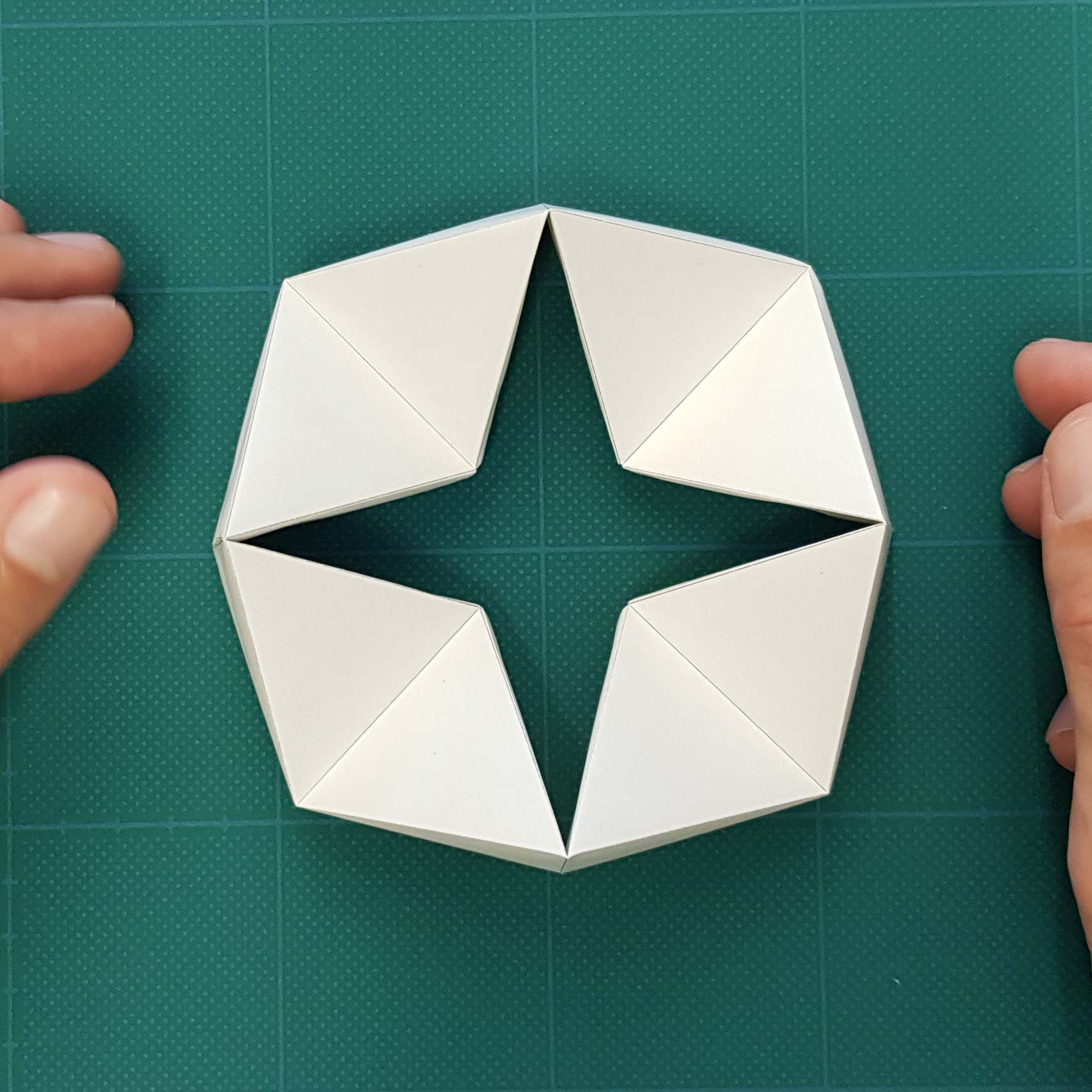 Nine-hinged Möbius Kaleidocycle mobile sculpture suspended from the ceiling at OIST