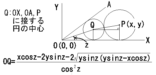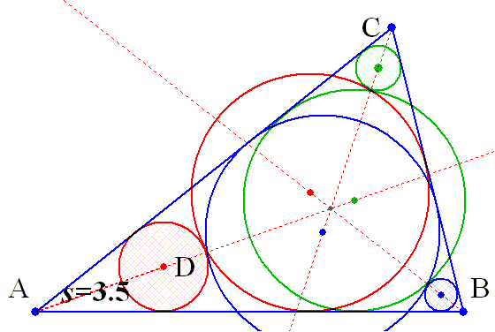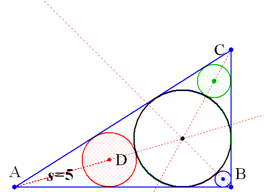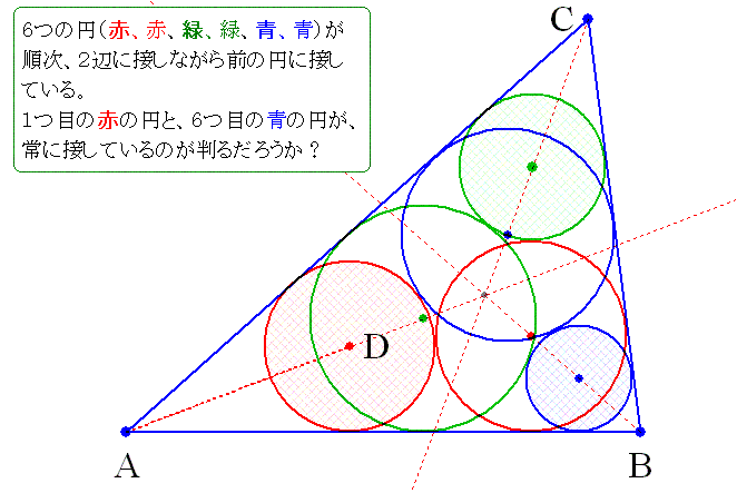 3角形ABCの2辺AB,ACに、接するように円Dを描く。 次に、辺AB,BCと円Dに接するように円を描く。 このように順次円を描いていくと、6つ目の円は円Dに接する。 |