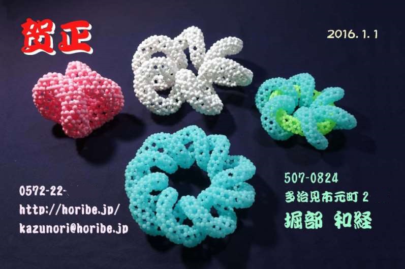 回転する3D-CGなど。 透明なビーズで編んで構造を見せいてる。Twist Tricolorも | |