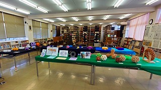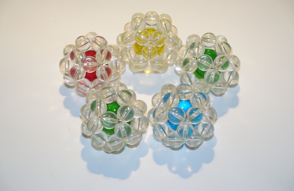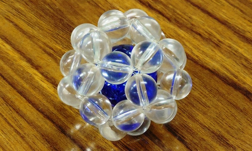 私の作品は、3つの白いビーズ編みです。(「本館」2階「球で編んだ立体模型」参照)