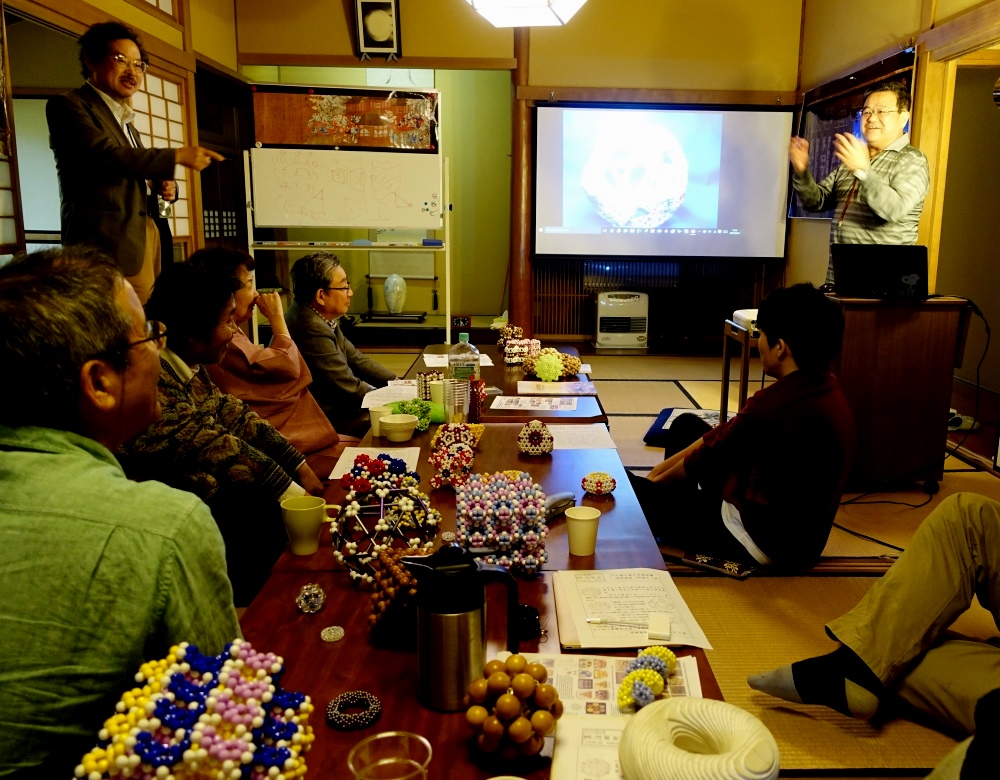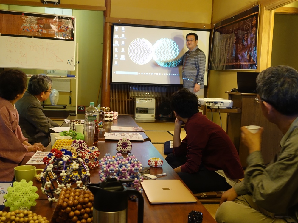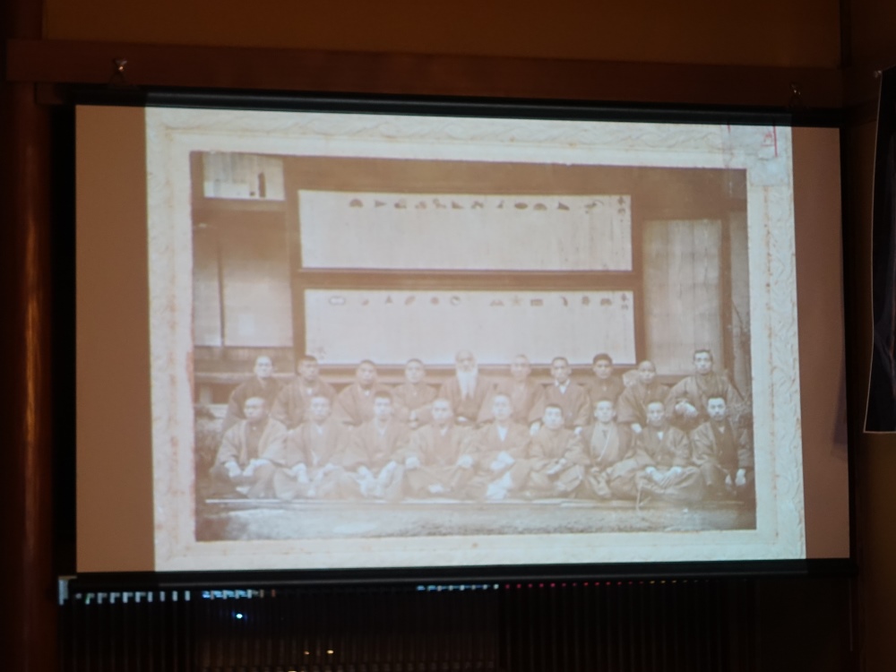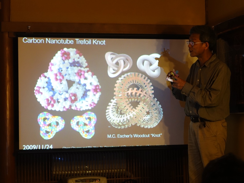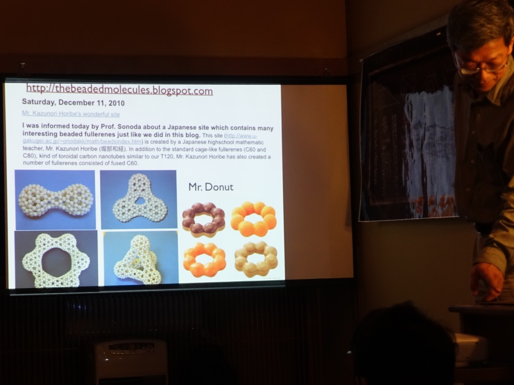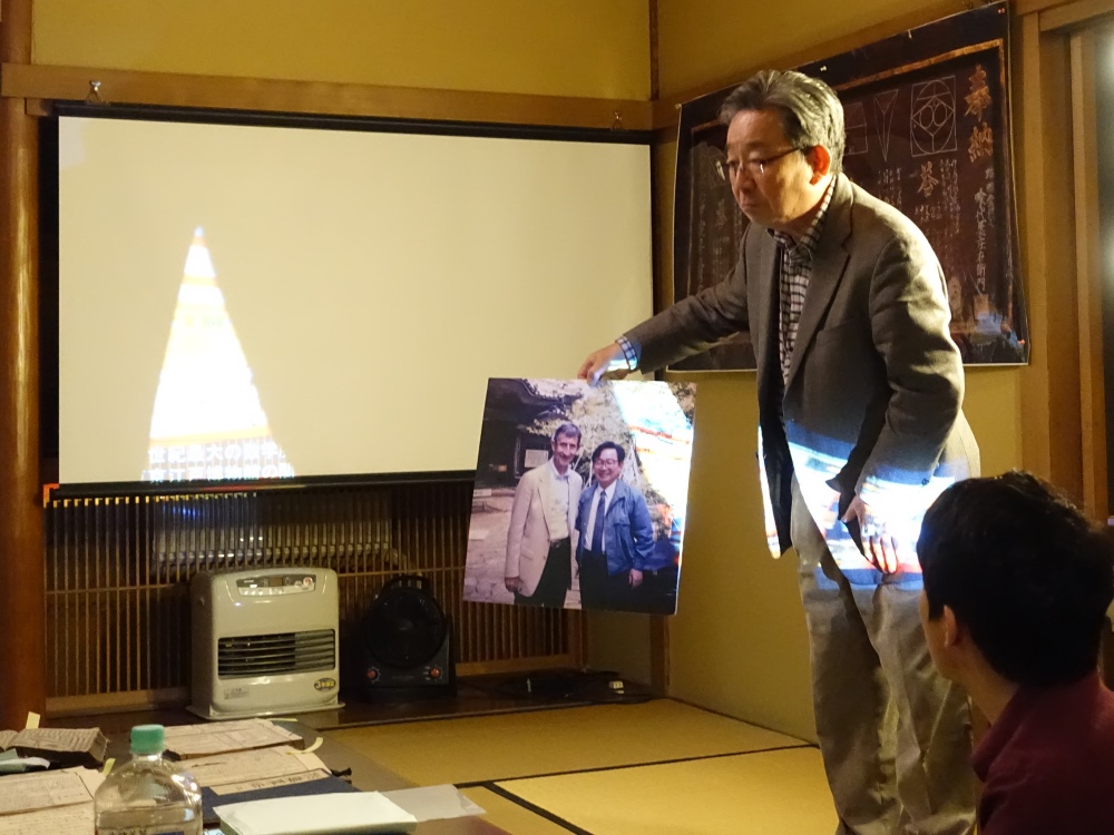 【4/23】深川先生のプレゼン・・・「フリーマン・ダイソンと深川先生の写真」の説明しているところ |