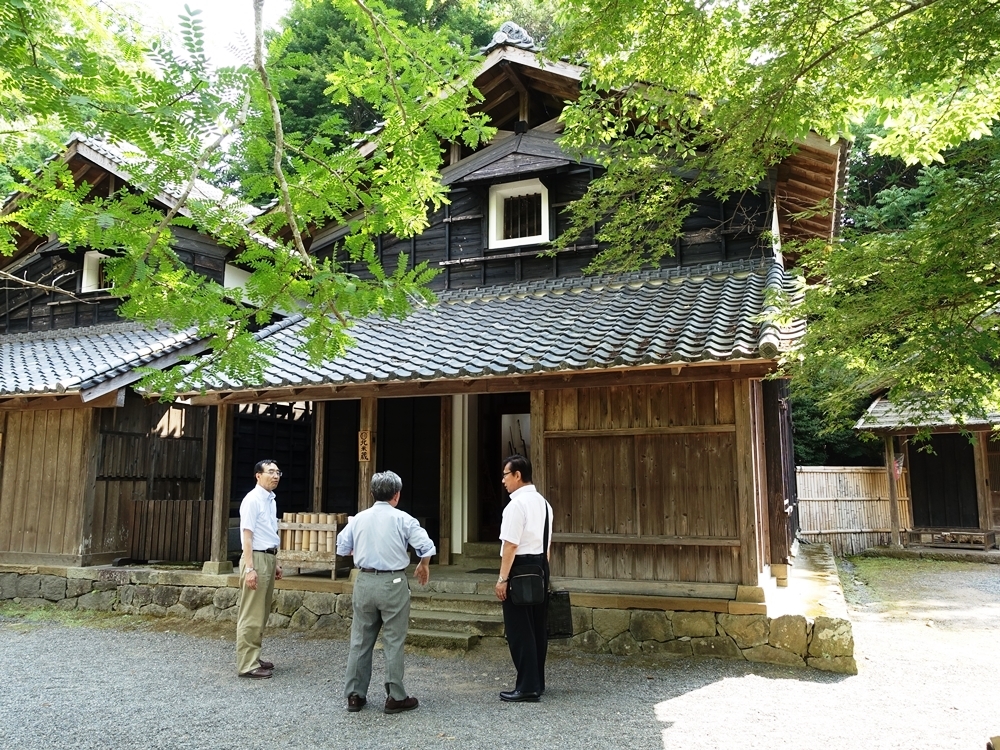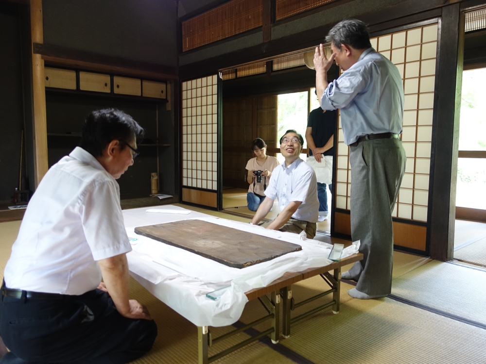 (3) 江川邸 北米倉・・・この中で算額が見つかった。 右側の出っ張っている所の中、多くの高札の間に挟まっていたそうです。 人物は、左から・・・公益財団法人江川文庫学芸員・橋本敬之氏、和算研究家・深川英俊氏、川瀬正臣氏 (撮影・堀部和経) |