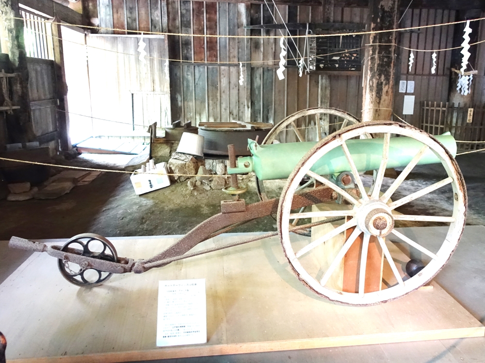 (16) 江川邸土間の展示 ボートホーウィッスル砲車(ペリーが日本に持ち込んだ砲車の実物)・・・(砲身と砲弾(玉)は、後の複製) この砲車は長い間消防ポンプを運ぶ台車として使用されていたそうです。(江川文庫学芸員・橋本敬之氏談) |