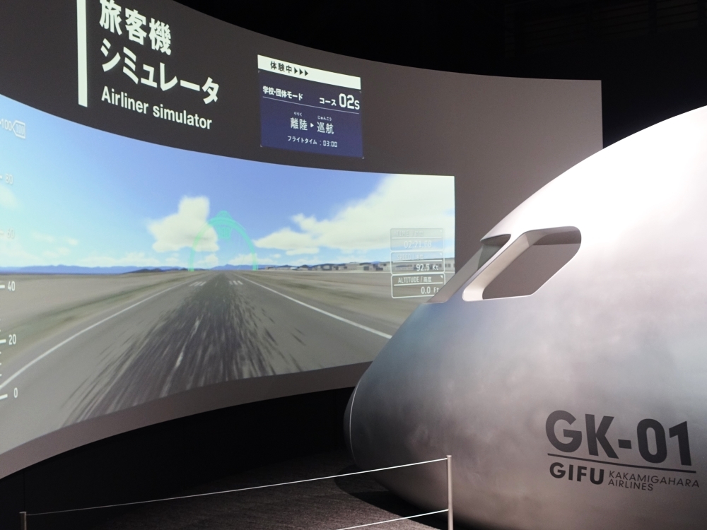 旅客機のシミュレータ(外から移す。模型のコックピットに座って操縦?) |