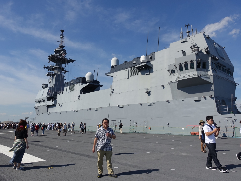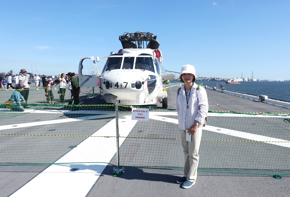 (10)記念写真(私)、右に見える窓はヘリの管制塔(船の後方側) |