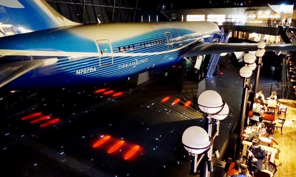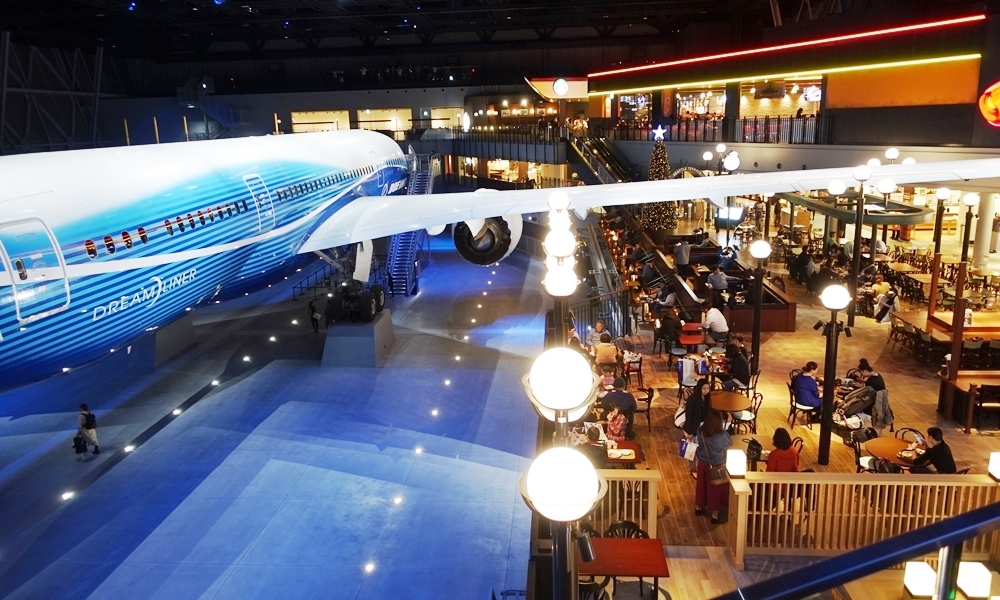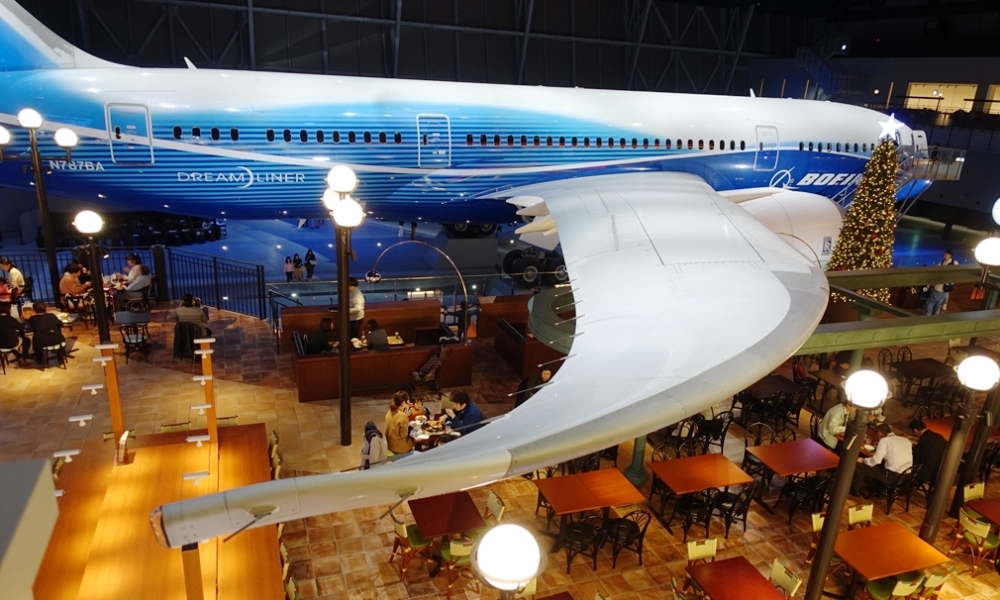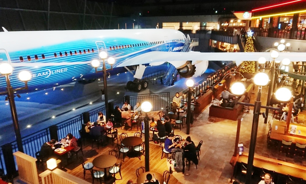 (12)2・3階は無料で行けます。「フードコート風・レストラン群」の横で、ゆるいカーブのウインクレットが目の前に・・・。 この形状のモノは、「ウイングレット」とは言わないで「レイクドウイングチップ」と言うようですね。・・・ 確認してみます ・・・ |