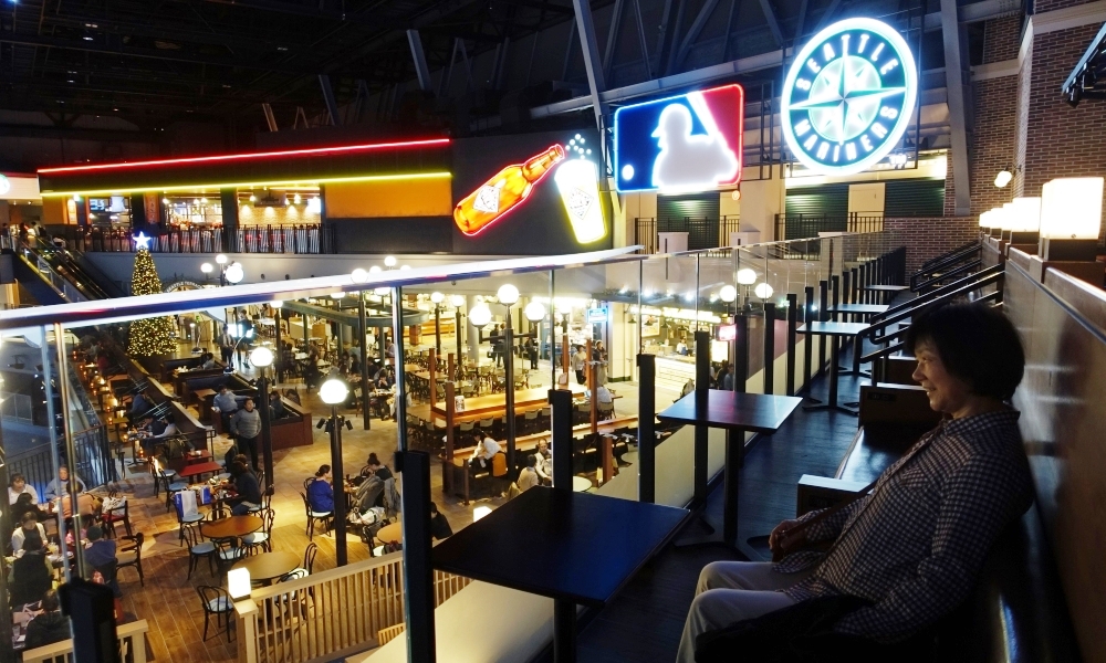 (2)1階に降り、有料施設に入って、4階正面の席に移動 |