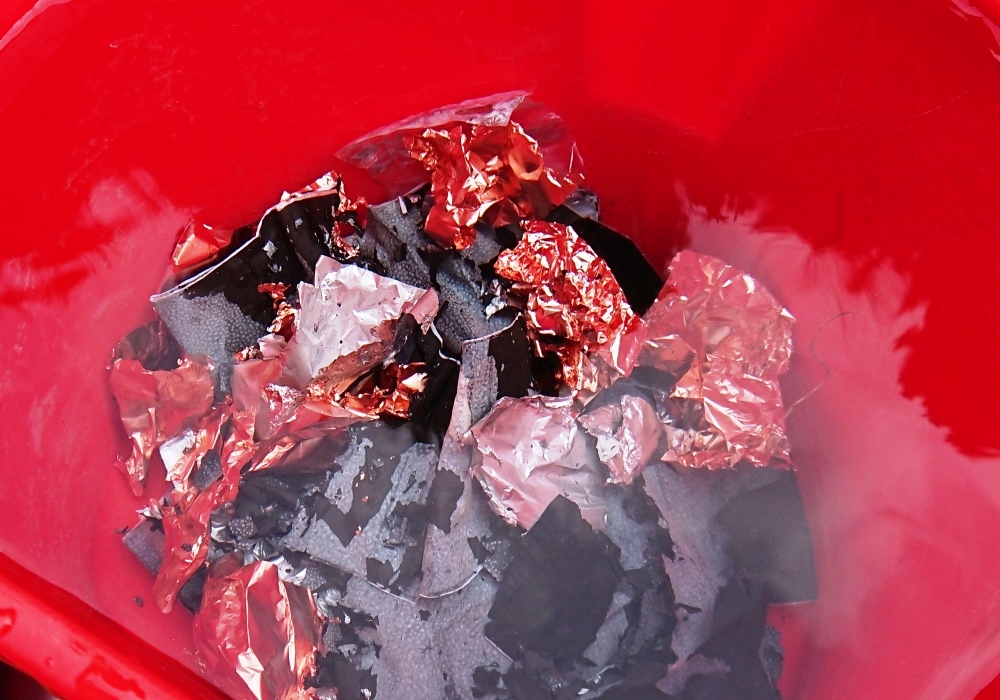 (8)ステンレスの水受けが悪くなるを避けるためプラの赤いバケツに入れて、庭に放置。 これで、温度上昇とか発火は、大丈夫でしょう。 |