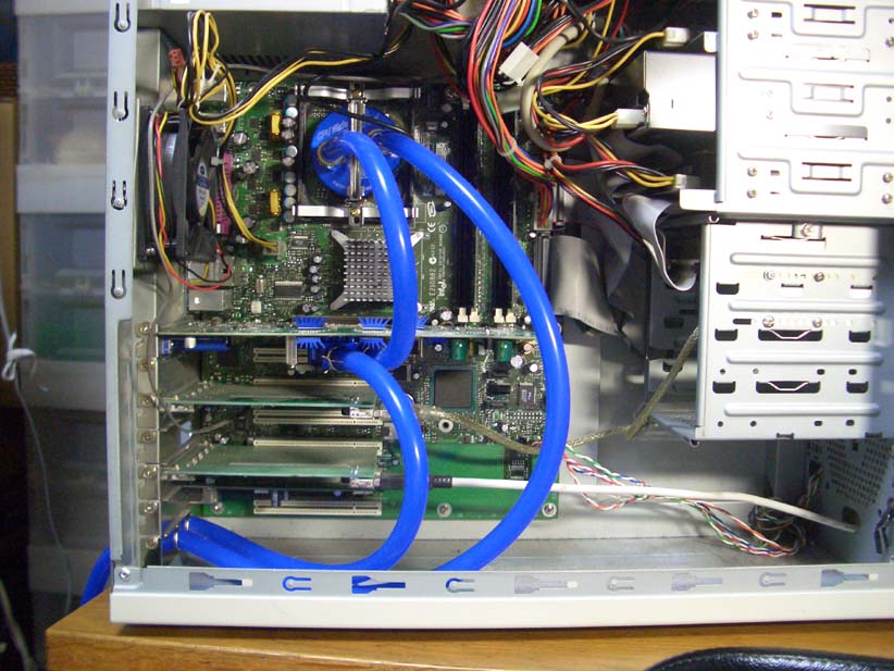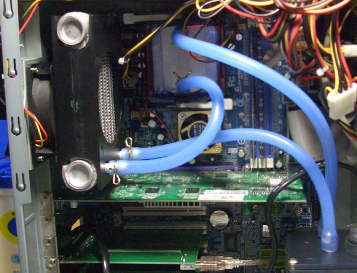 奥にCPU、左がラジエター、右下にポンプ部(水タンク兼用)